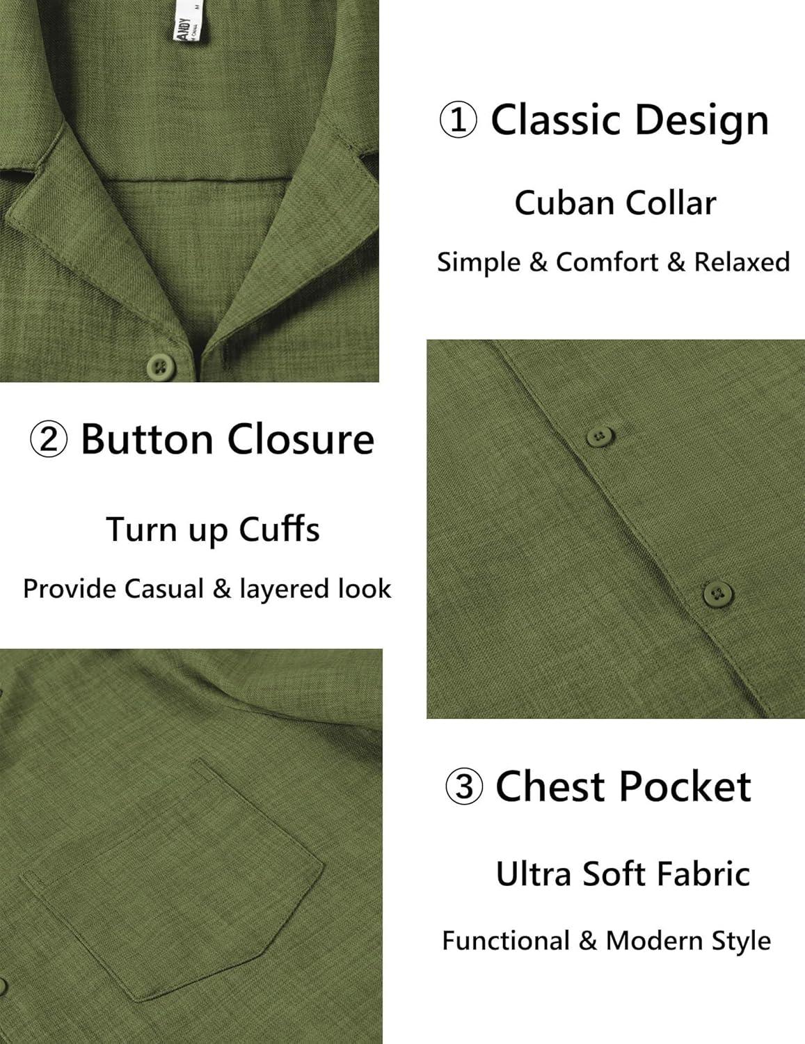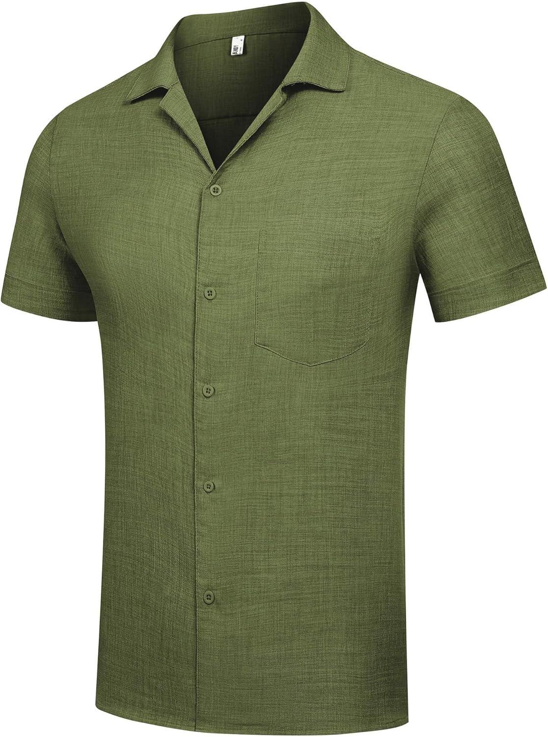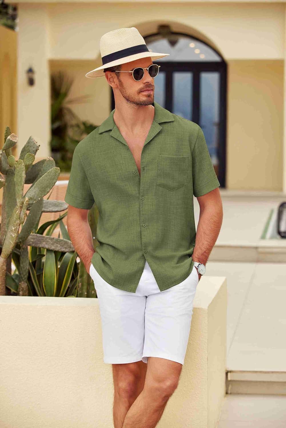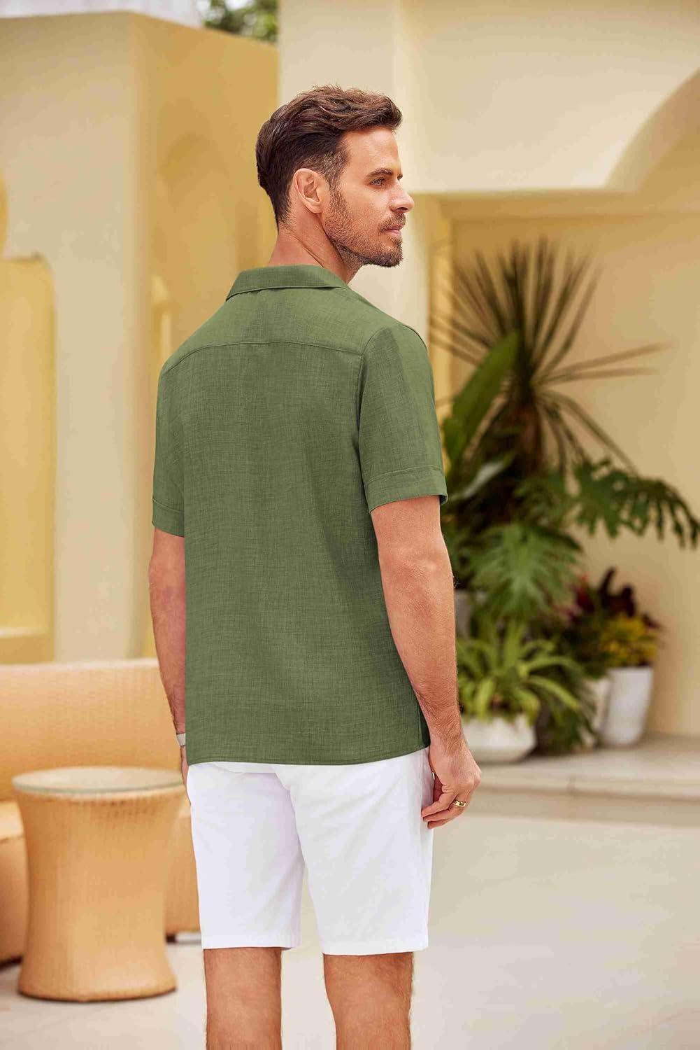 COOFANDY Mens Casual Short Sleeve Button Down Shirts Cuban Linen Textured Shirt Summer Beach Wear(Olive Green)