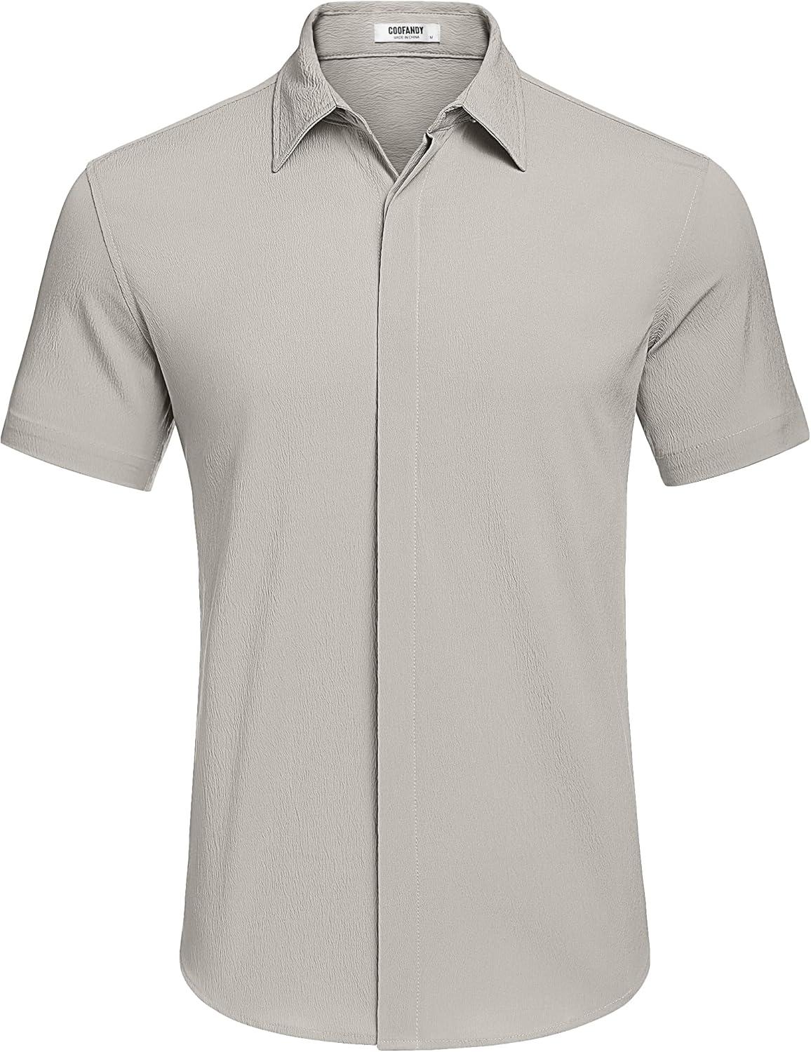 COOFANDY Men’s Casual Short Sleeve Button Down Summer Beach Shirt Lightweight Textured Wrinkle Free Stretch Shirts(Quiet Gray)