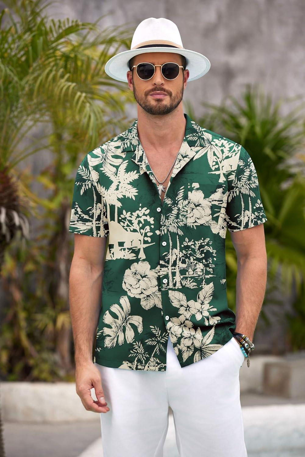 COOFANDY Mens Casual Short Sleeve Shirts Summer Beach Shirt Button Down Textured Shirts Vacation Hawaiian Shirts(Green Palm Tree)