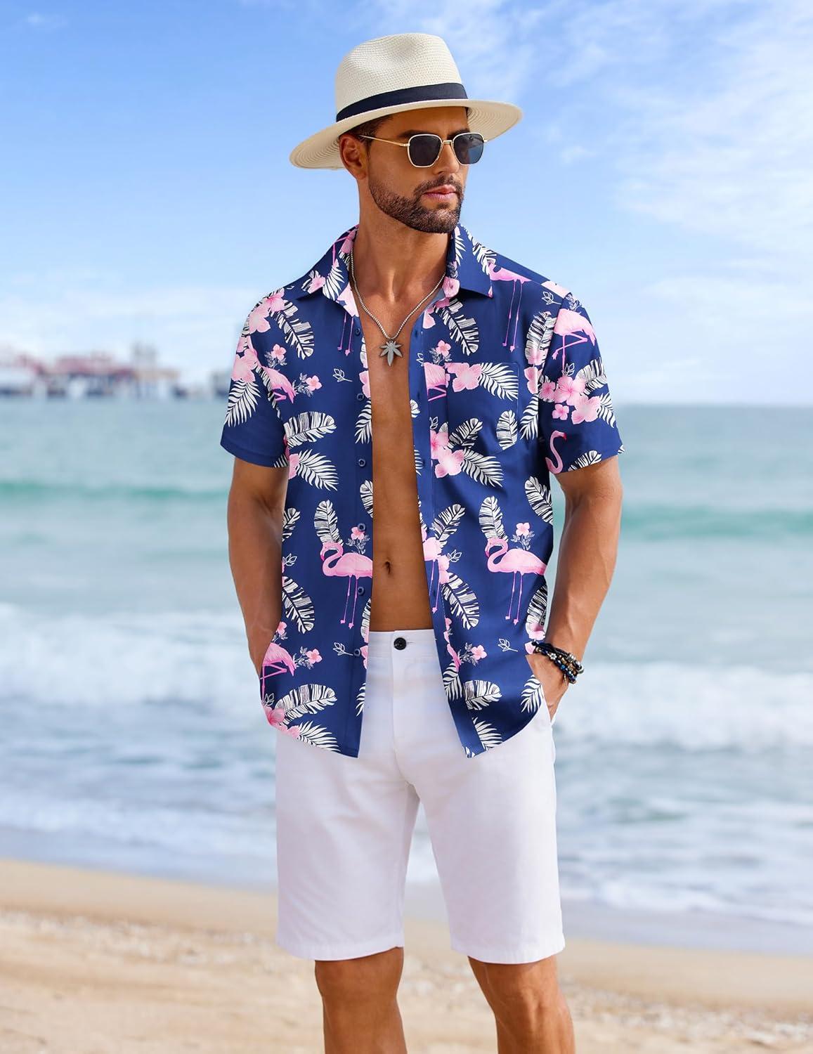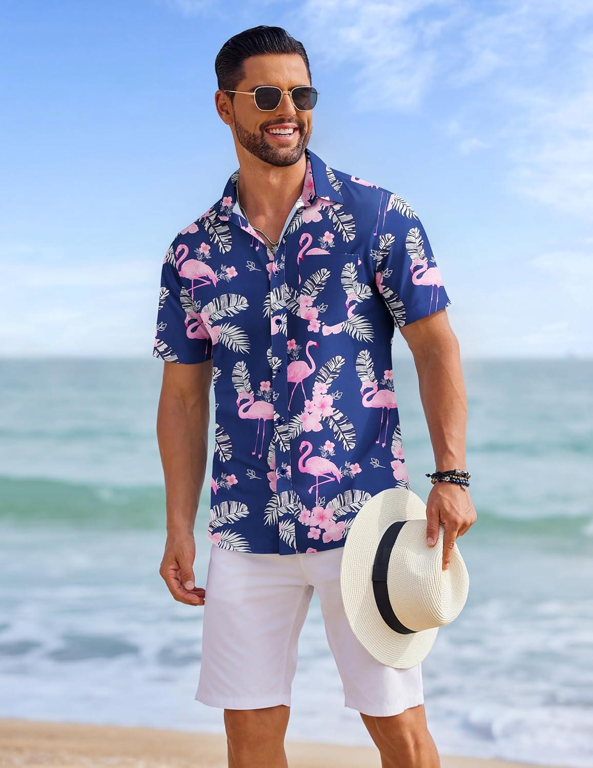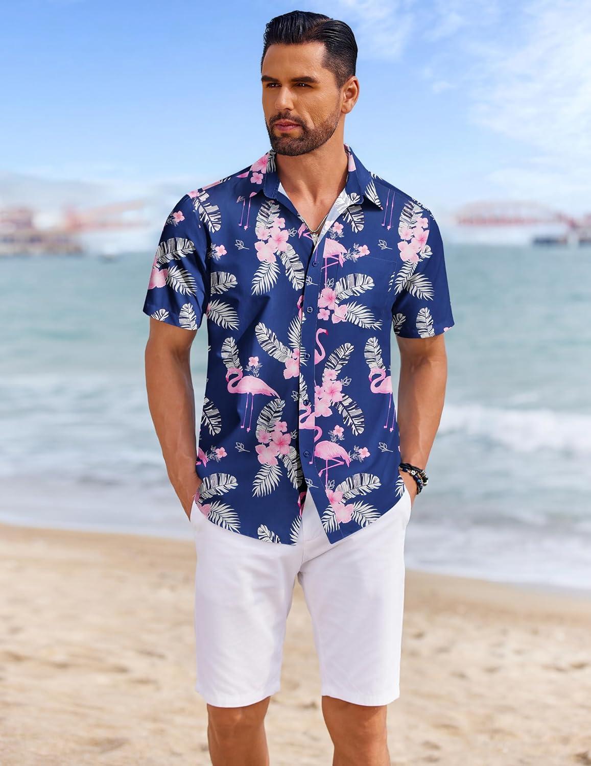 COOFANDY Mens Casual Short Sleeve Shirts Summer Beach Shirt Button Down Textured Shirts Vacation Hawaiian Shirts(Navy Blue – Flamingo)