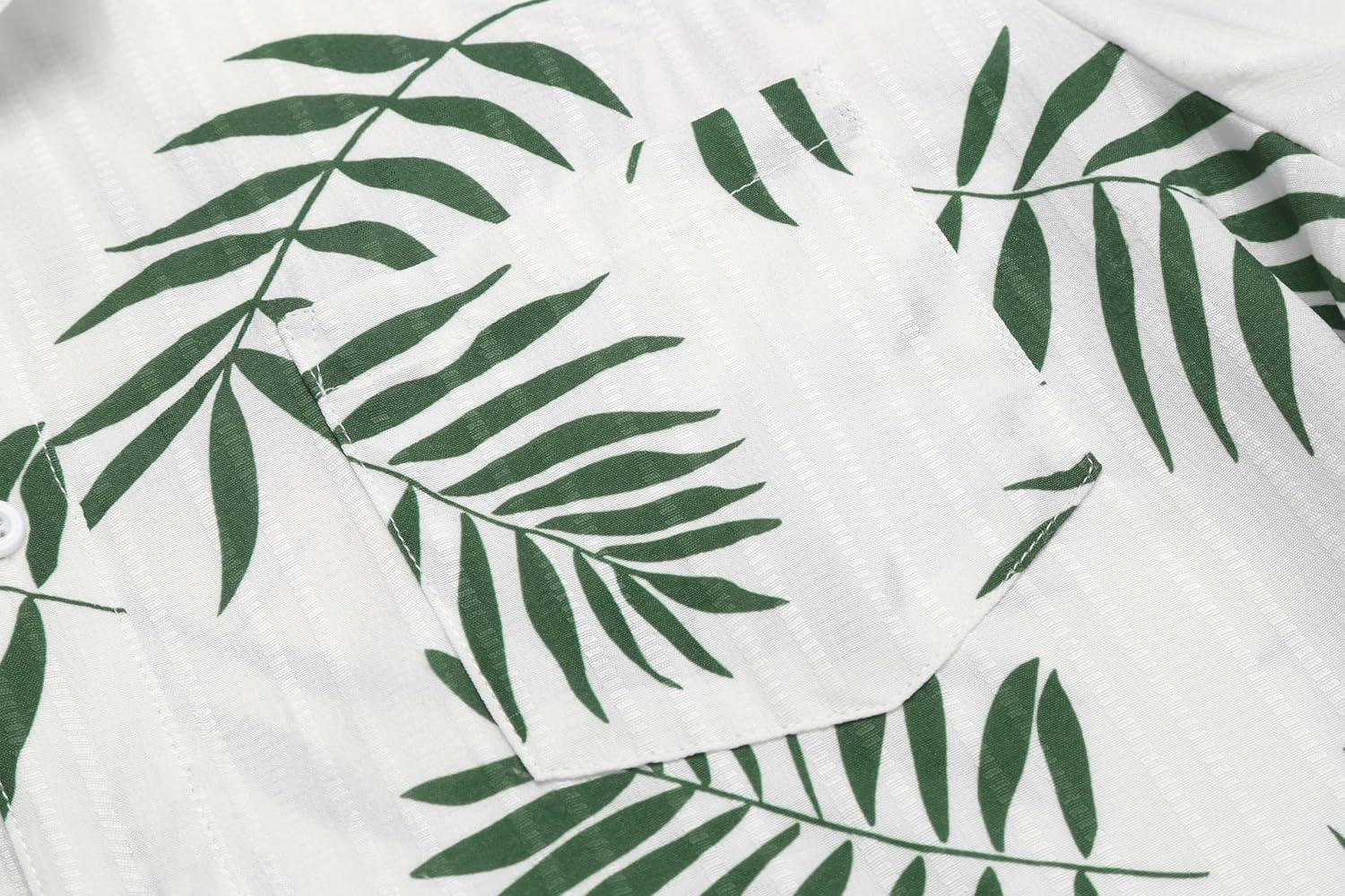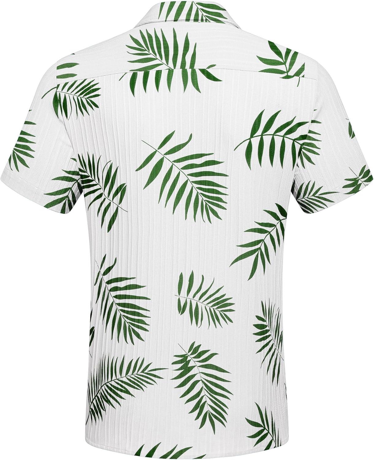 COOFANDY Mens Casual Short Sleeve Shirts Summer Beach Shirt Button Down Textured Shirts Vacation Hawaiian Shirts(White-green Leaves)