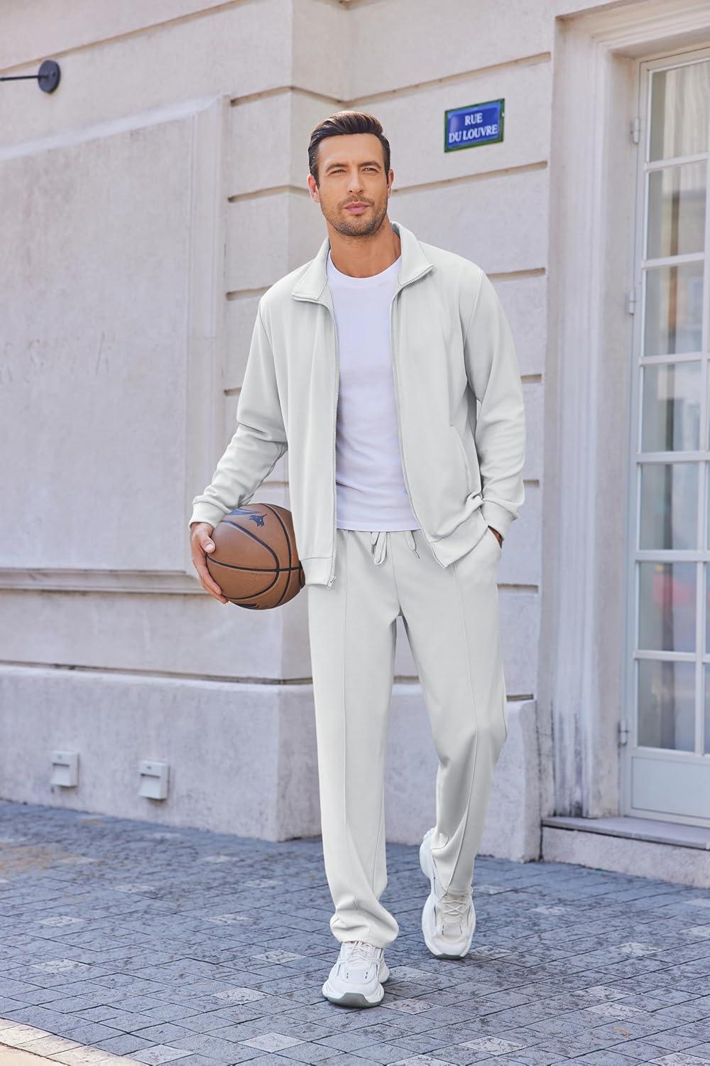 COOFANDY Men’s Casual Sweatsuit 2 Piece Athletic Full Zip Tracksuit Jacquard Jogging Set Fashion Jackets And Pants Outfit(White)