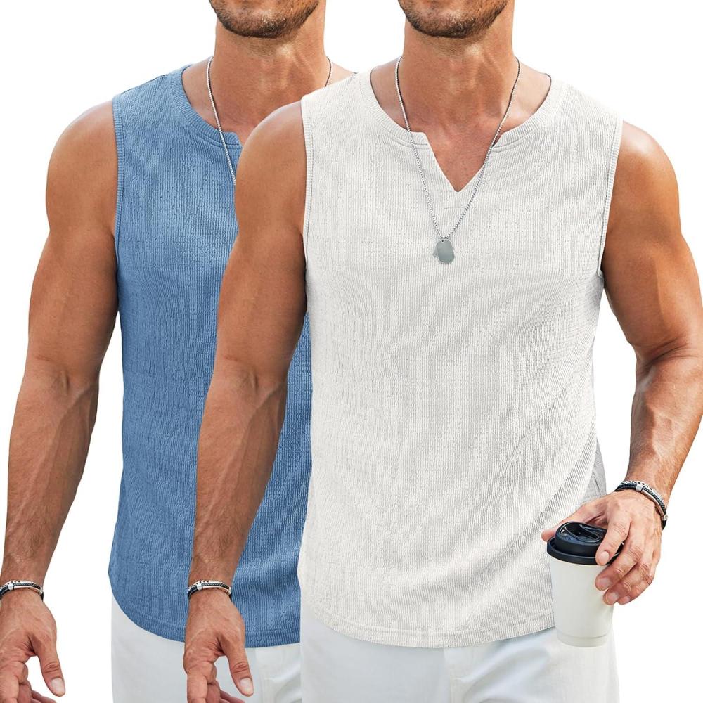 COOFANDY Men’s Casual Tank Tops Knit V Neck Sleeveless T Shirts 2 Pack Summer Beach Lightweight Muscle Tee(White/Blue)