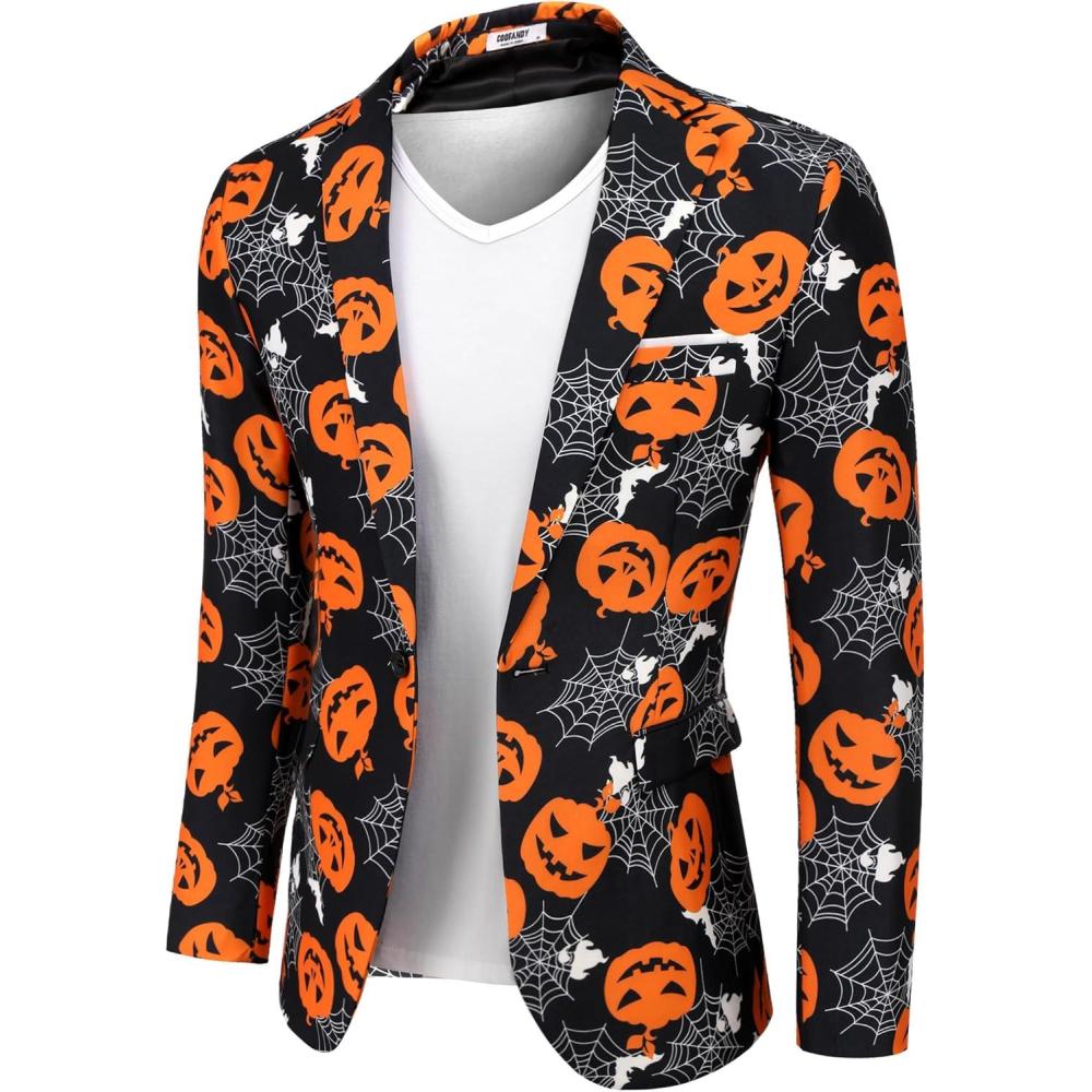 COOFANDY Men’s Christmas Blazer Jacket One Button Halloween Sport Coat Christmas Party Holiday Jacket(Halloween Blazer – Pumpkin & Bat)