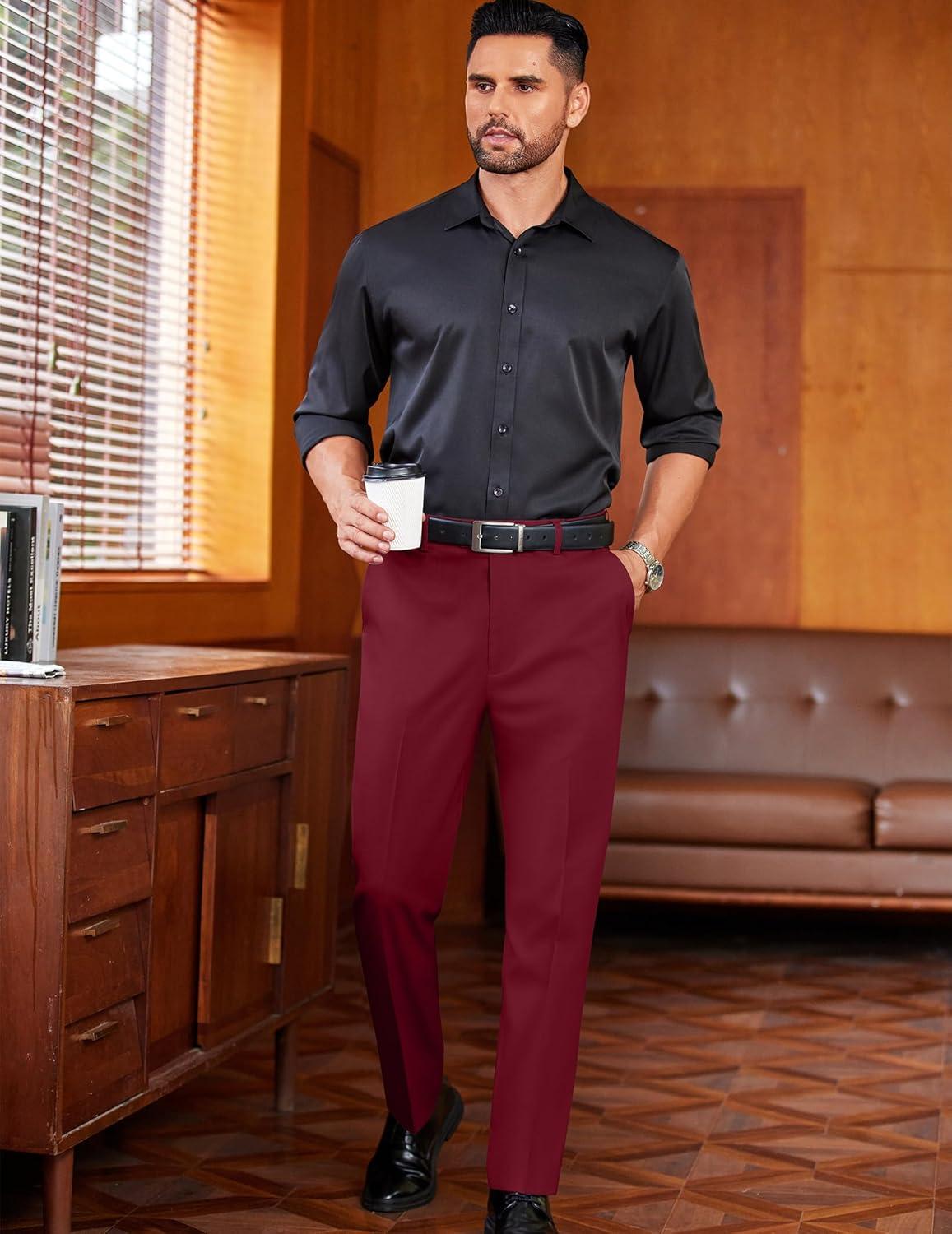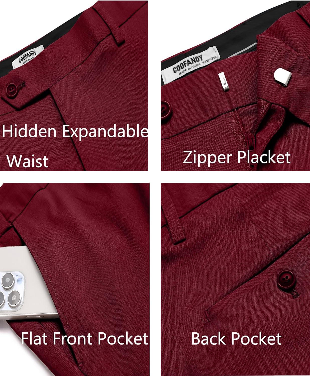COOFANDY Mens Classic Casual Dress Pants Expandable Waist Suit Pant Slim Fit Flat Front Slacks(Dark Red)