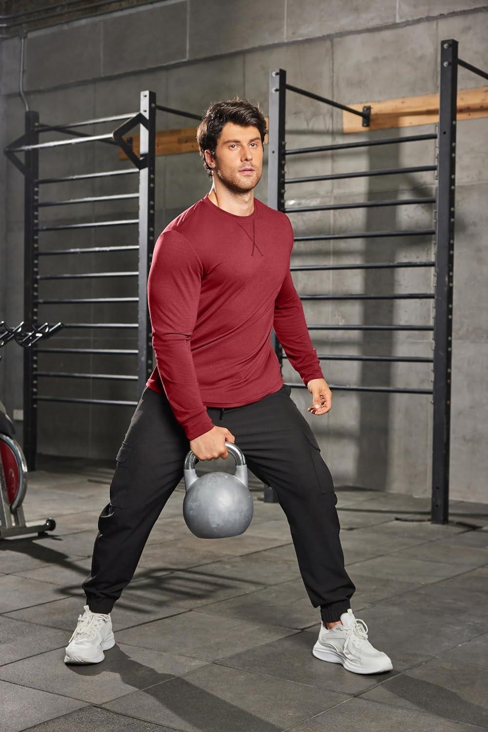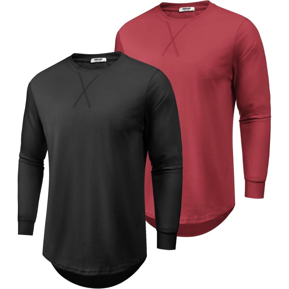 COOFANDY Mens Cotton Hipster Hip Hop Longline Crewneck T Shirts Casual Long Sleeve Tees Curved Hem Gym Shirts(Two Pack- Black + Wine Red)