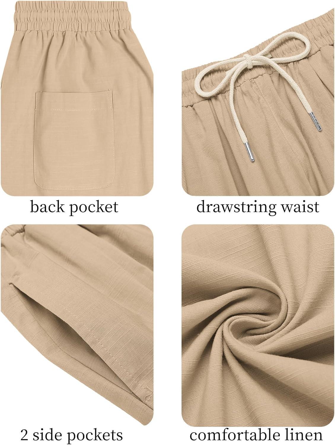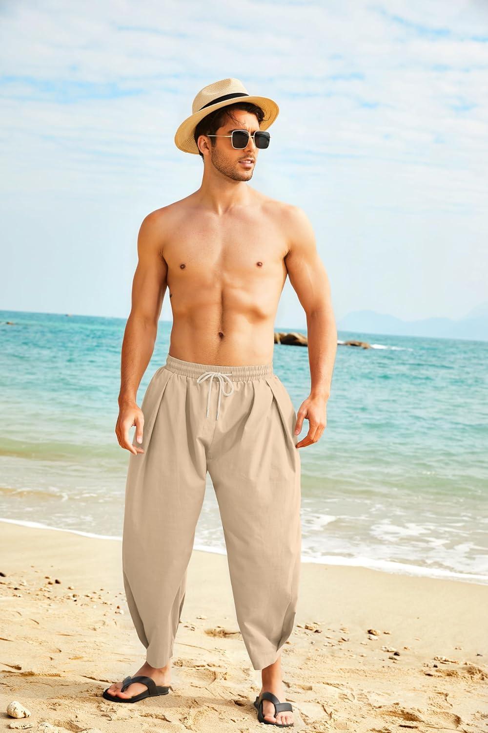 COOFANDY Men’s Cotton Linen Harem Pants Drawstring Casual Cropped Trousers Lightweight Loose Beach Yoga Pants with Pockets(Light Brown)