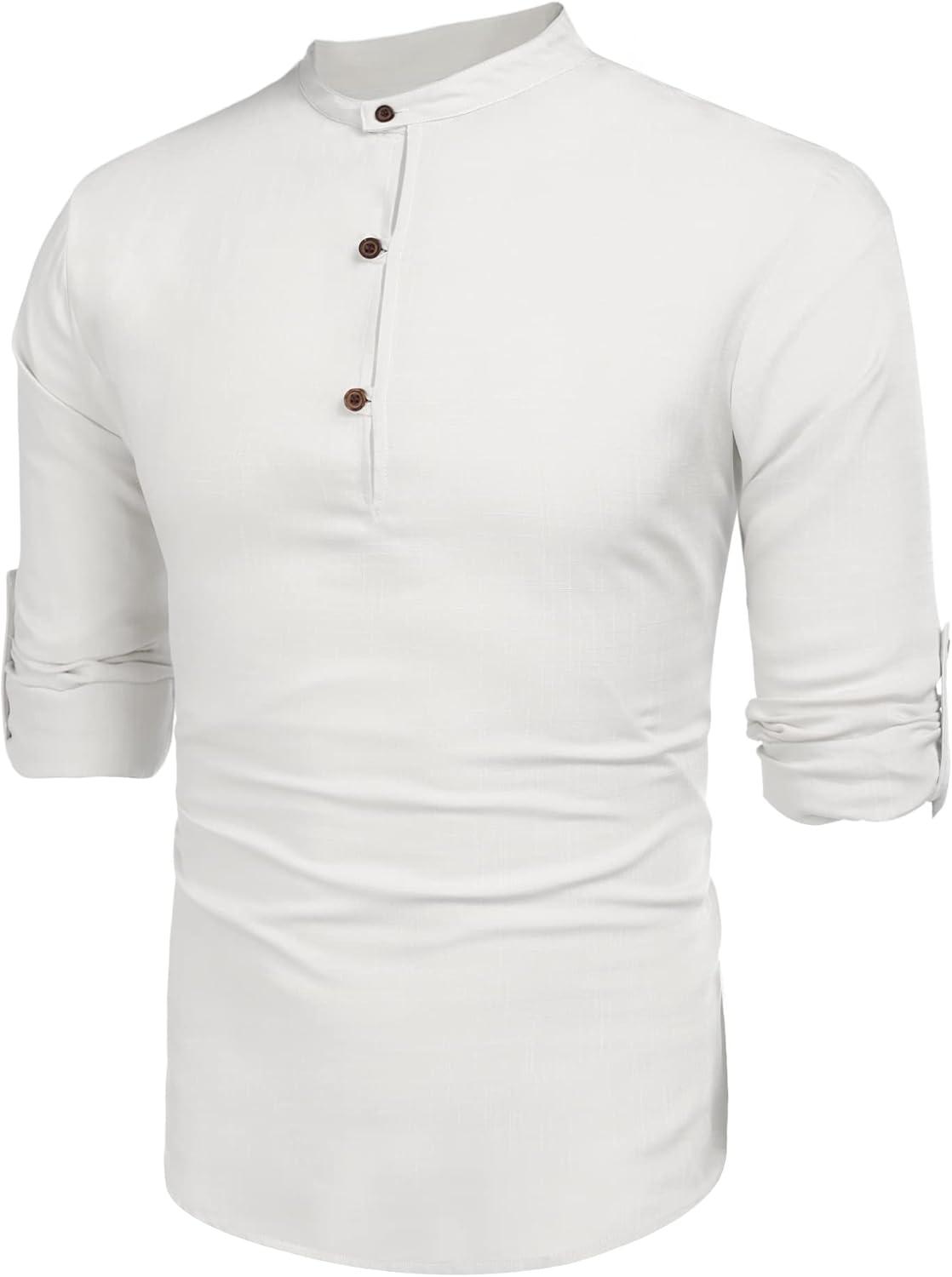 COOFANDY Men’s Cotton Linen Henley Shirt Casual Beach Hippie Shirts Long Sleeve T-Shirts(A_white)