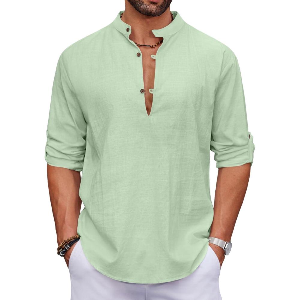 COOFANDY Men’s Cotton Linen Henley Shirt Casual Beach Hippie Shirts Long Sleeve T-Shirts(Light Green)