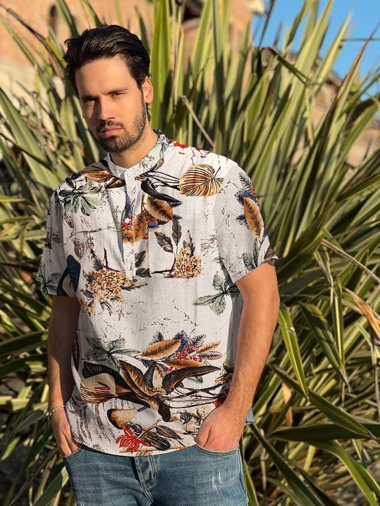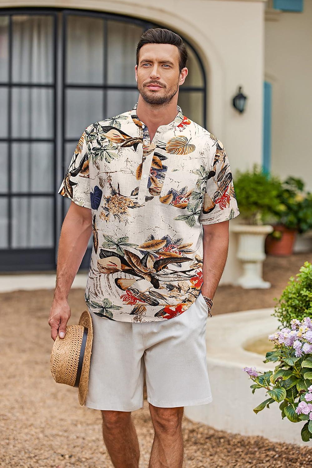 COOFANDY Men’s Cotton Linen Henley Shirt Short Sleeve Hippie Casual Beach T-Shirts with Pocket(Khaki Floral)