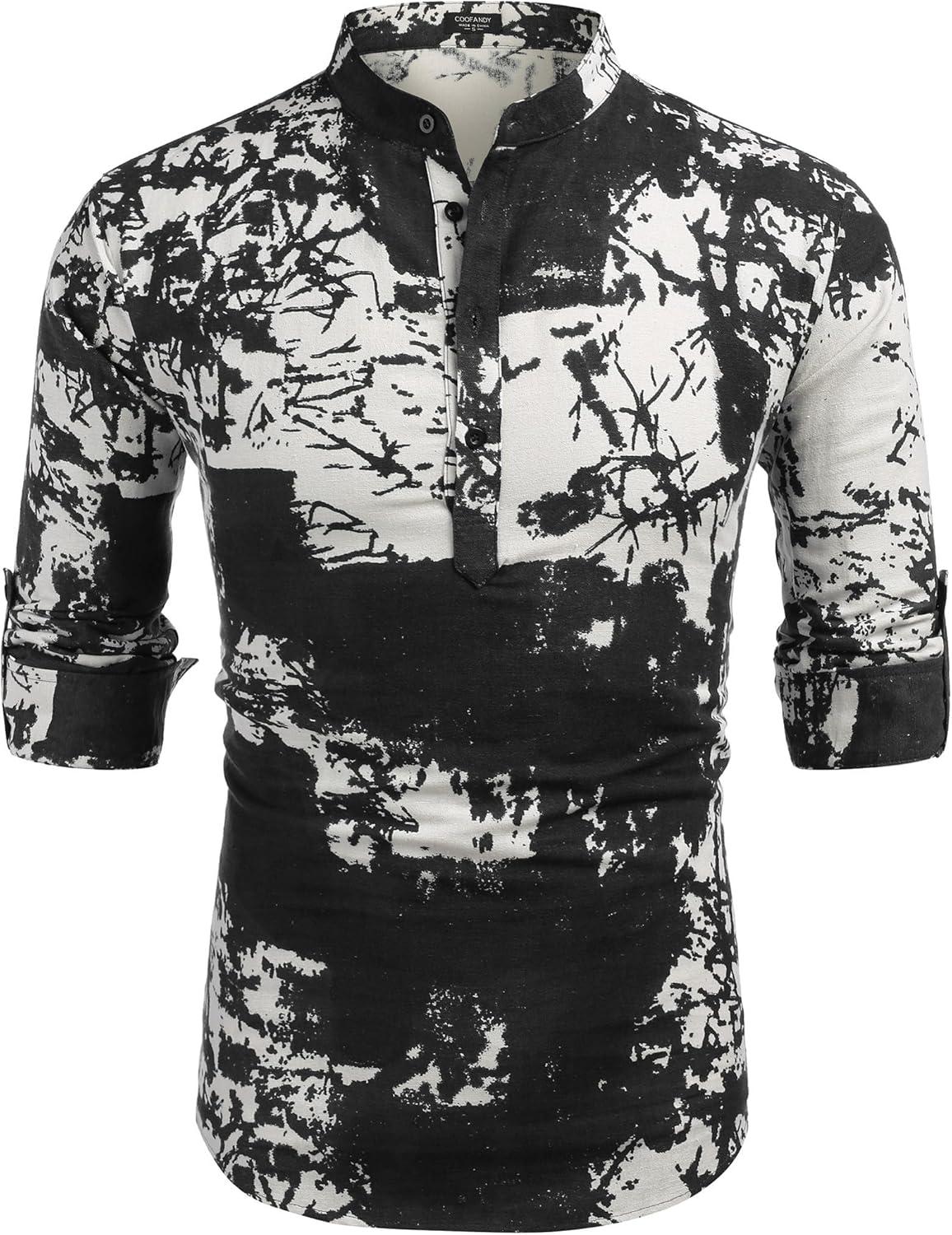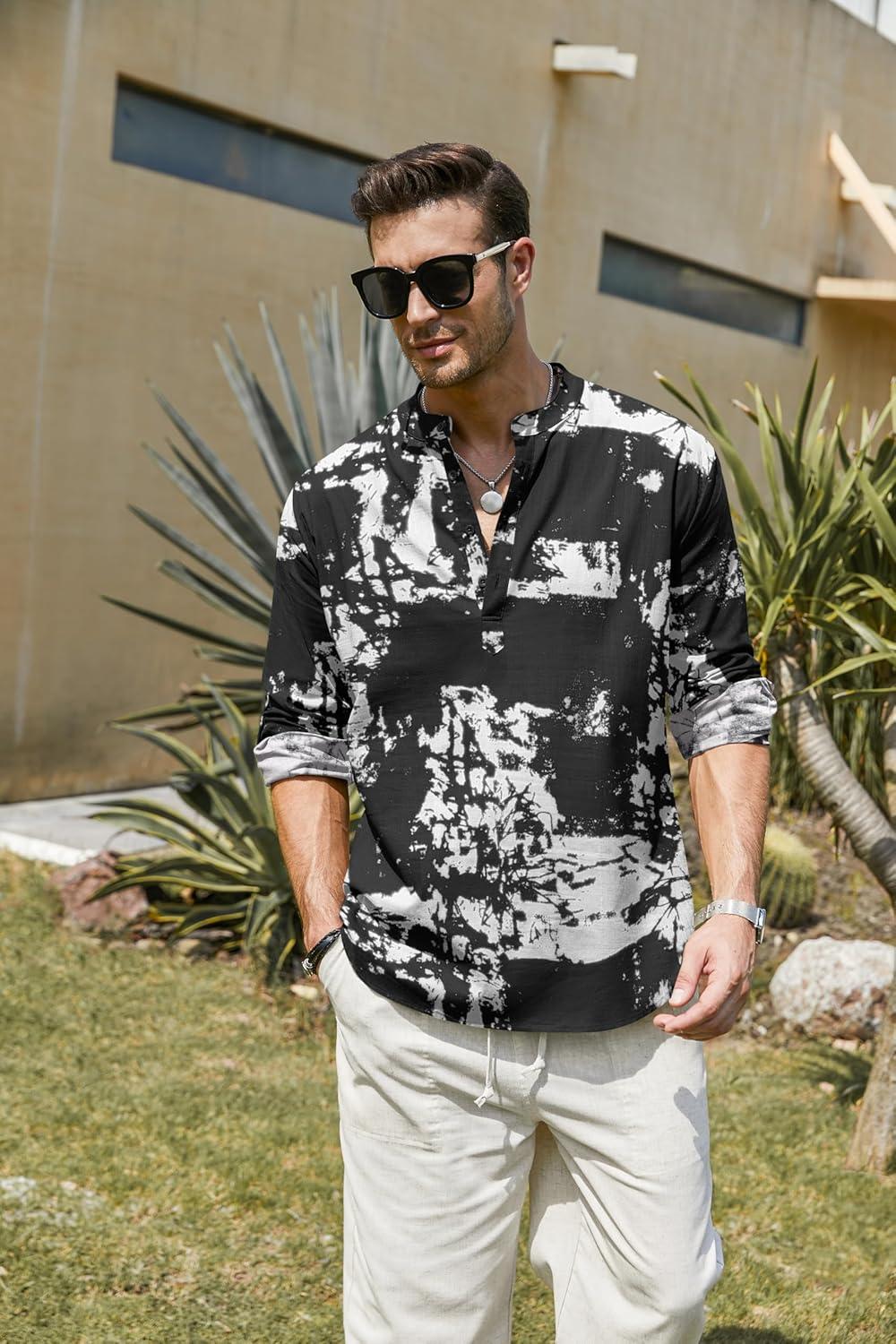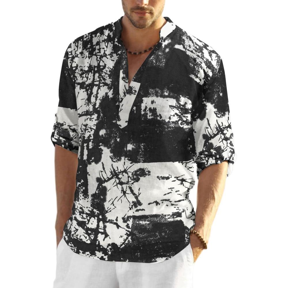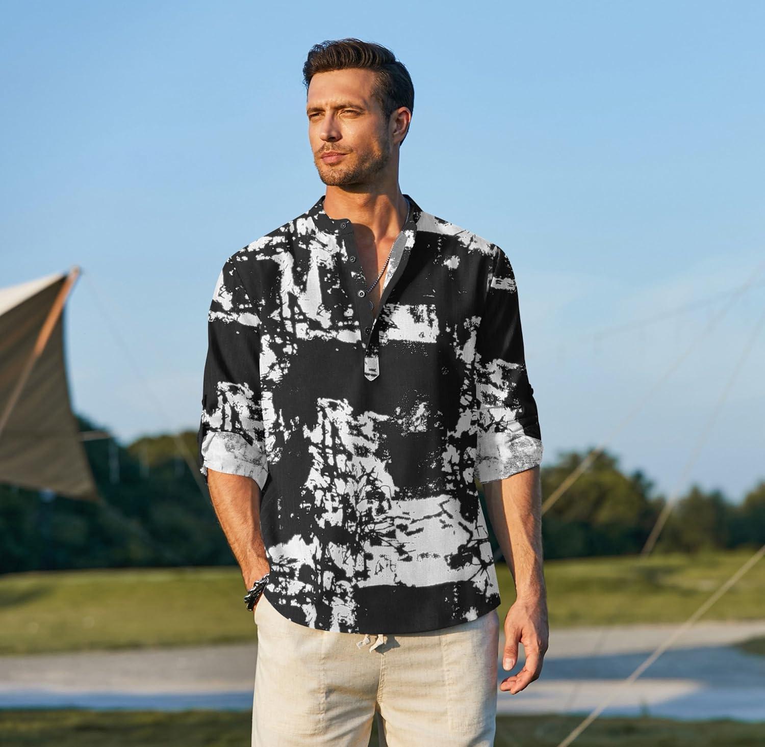 COOFANDY Men’s Cotton Linen Henley T-Shirt Long Sleeve Hippie Casual Beach T-Shirts(Black Tie-dye)