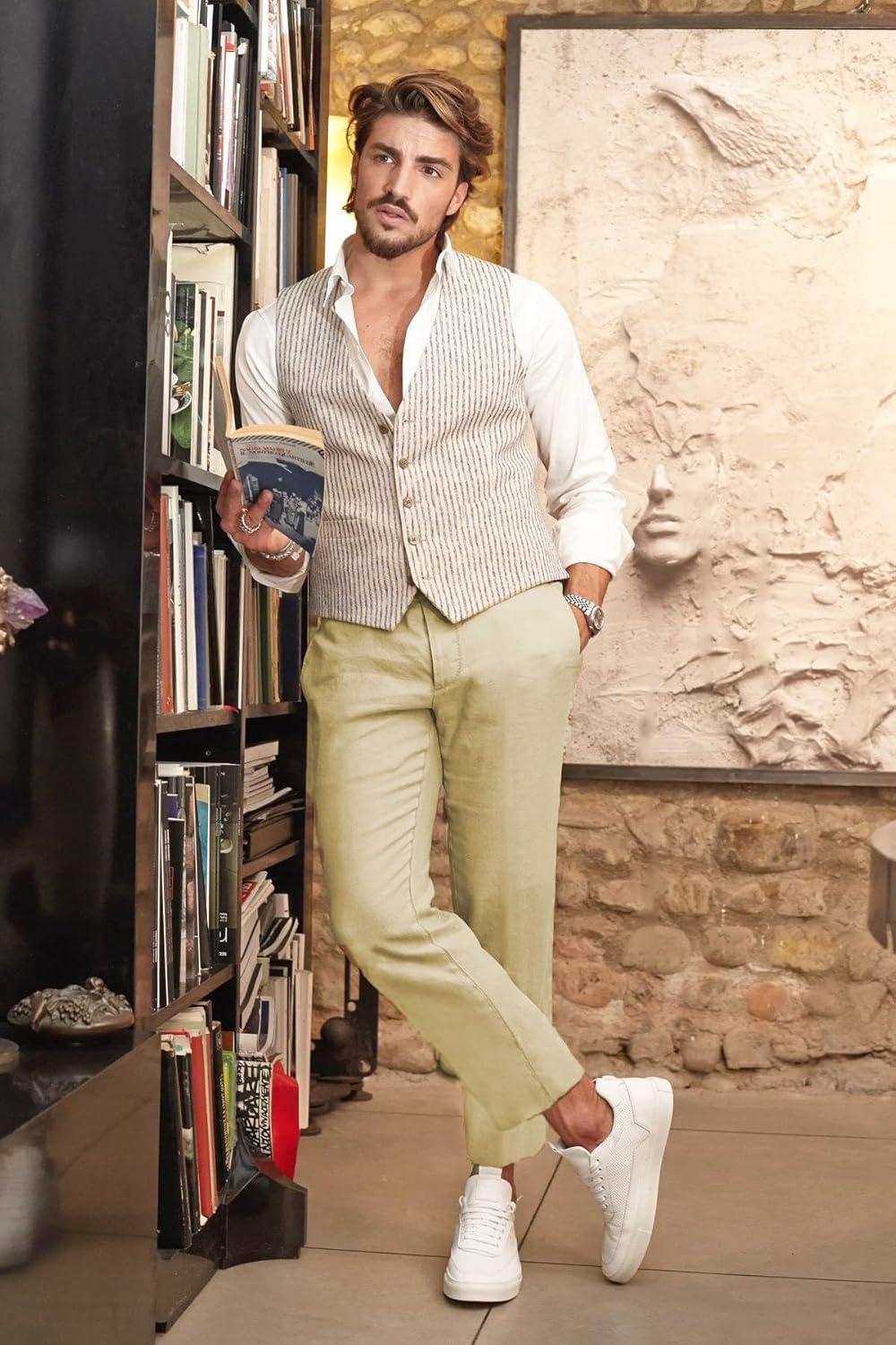 COOFANDY Men’s Cotton Linen Pants Elastic Waist Lightweight Casual Pants Relaxed Fit Yoga Beach Pants with Pockets(02-khaki)