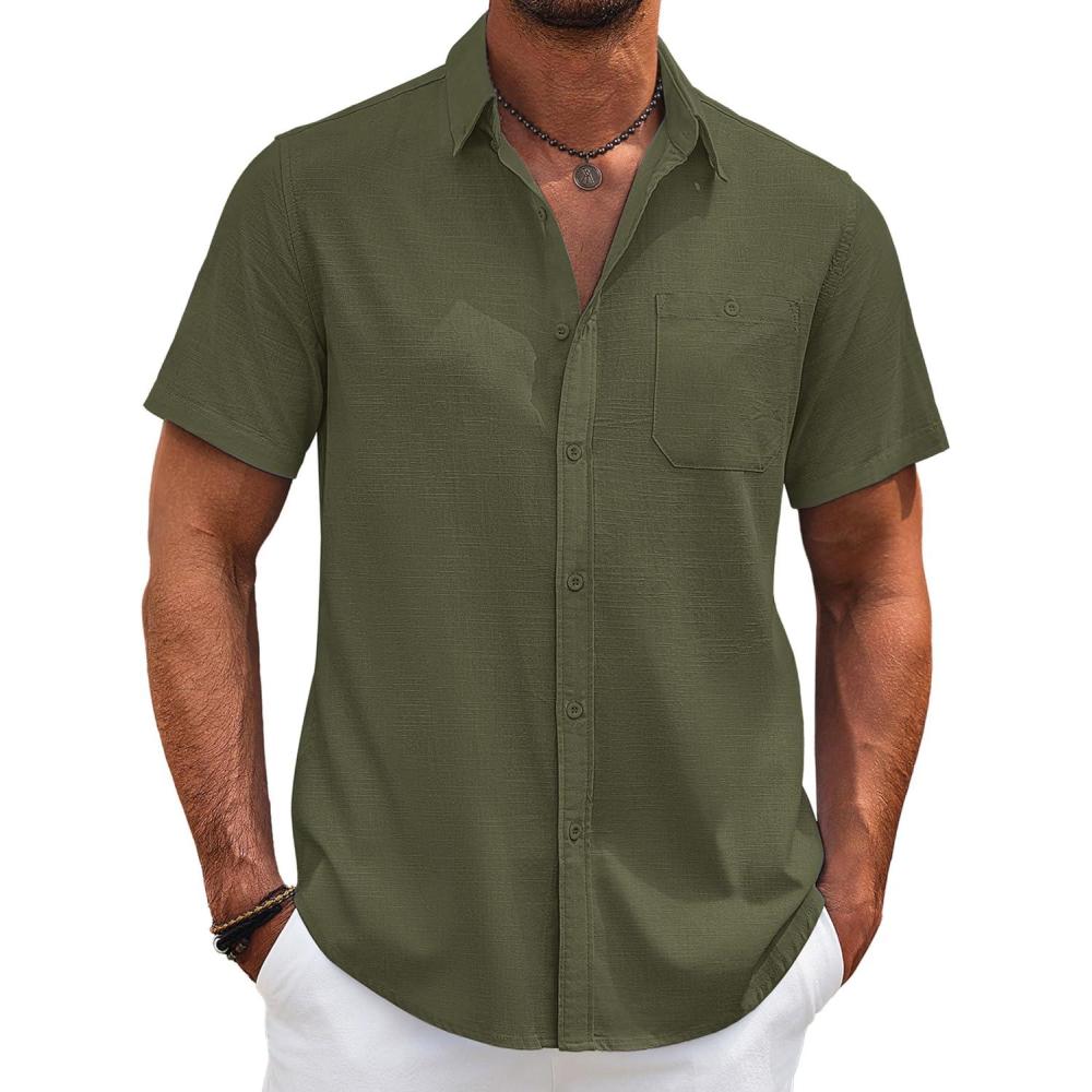 COOFANDY Men’s Cotton Linen Shirts Short Sleeve Casual Shirts Summer Button Down Shirt Linen Beach Vacation Shirt(Army Green)