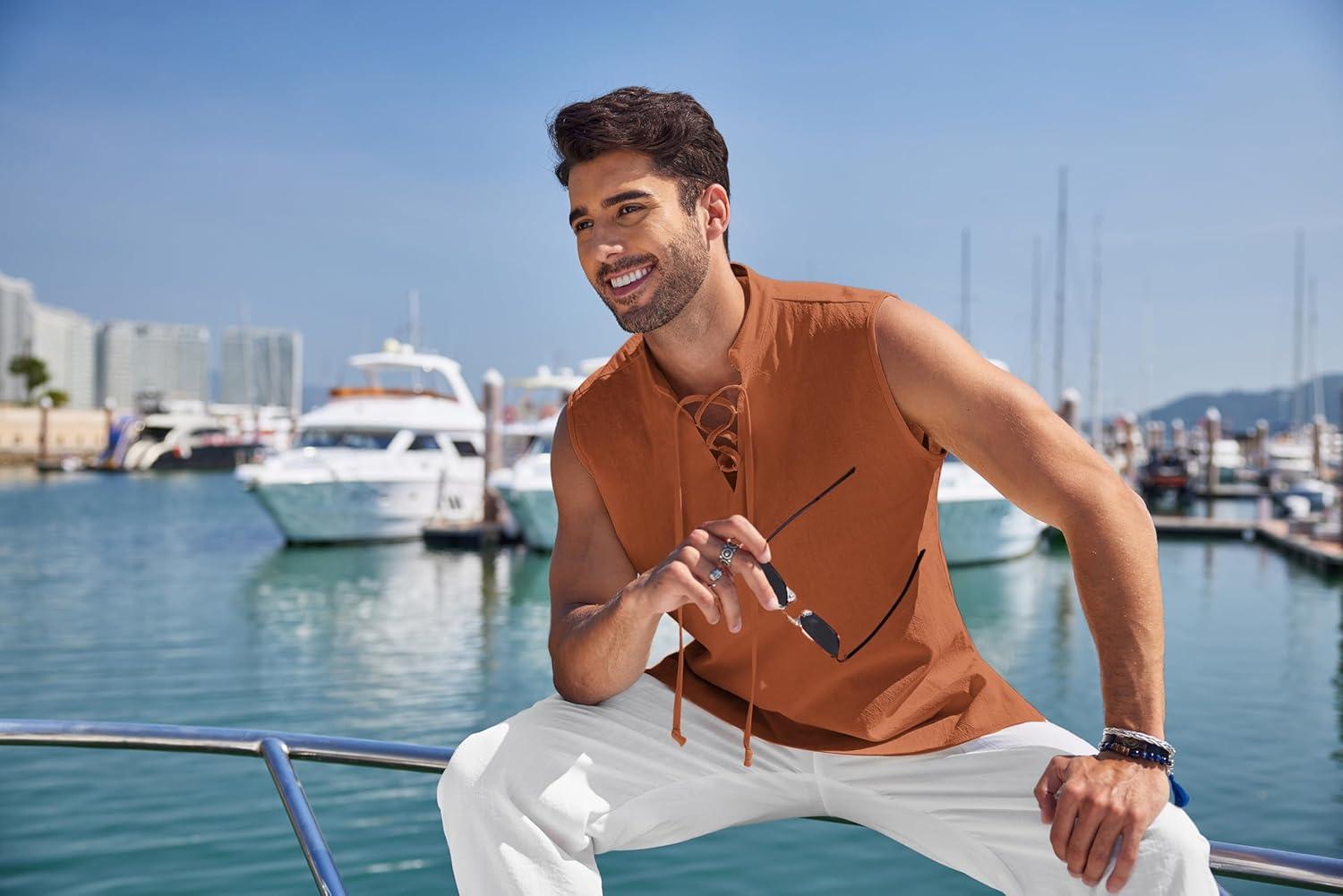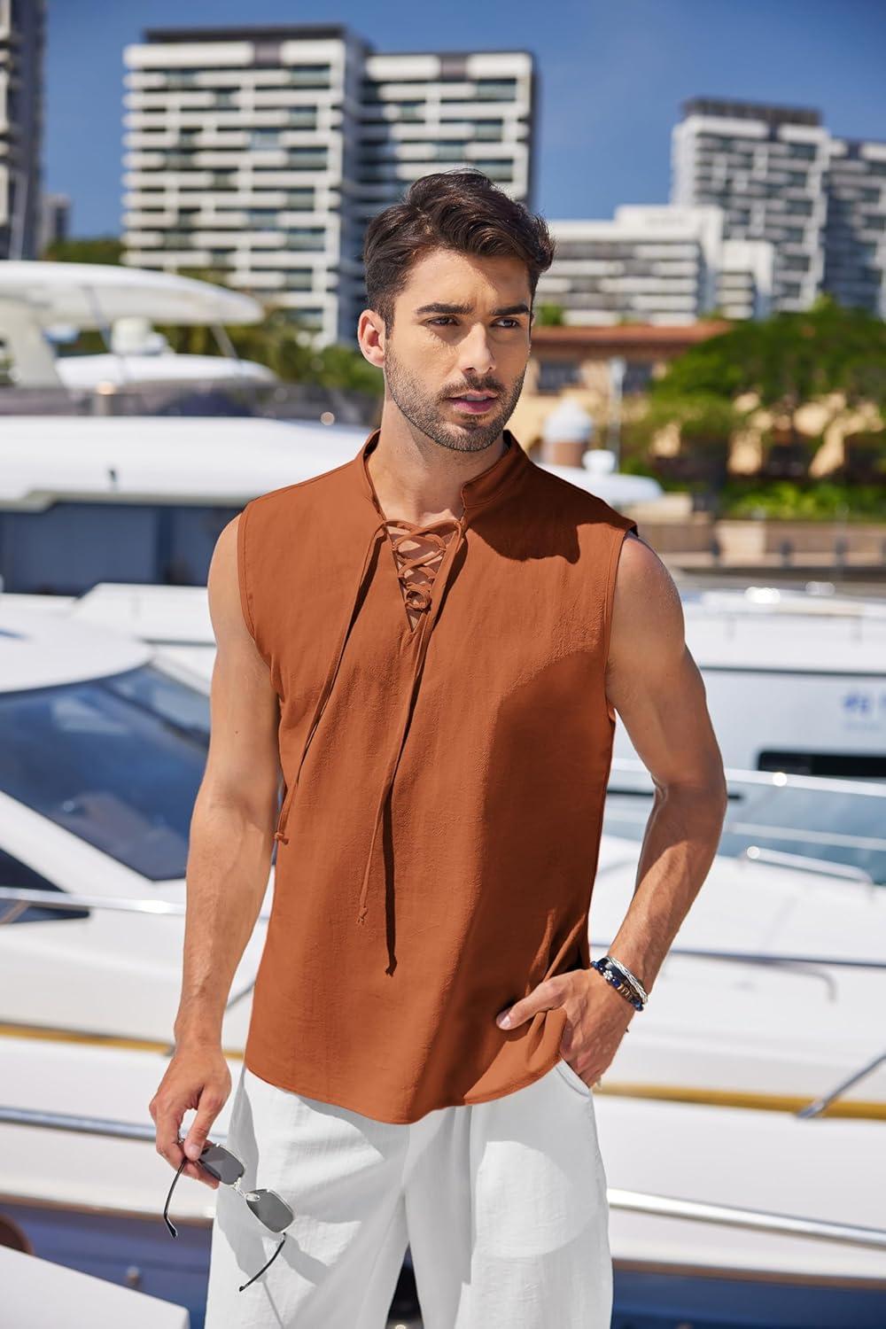 COOFANDY Men’s Cotton Linen Tank Top Shirts Casual Sleeveless Lace Up Beach Hippie Tops Bohemian Renaissance Pirate Tunic(Brick Red)