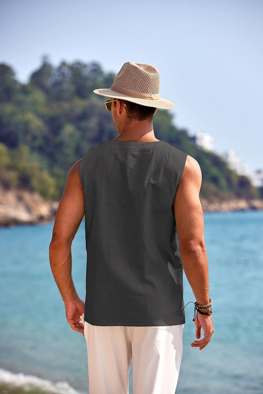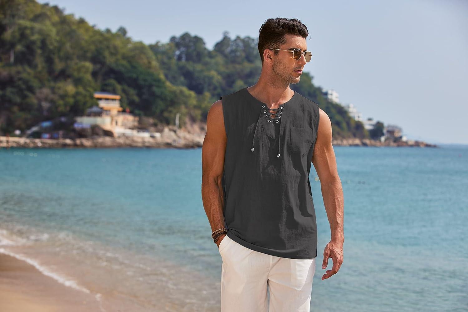 COOFANDY Men’s Cotton Linen Tank Top Shirts Casual Sleeveless Lace Up Beach Hippie Tops Bohemian Renaissance Pirate Tunic(Charcoal)