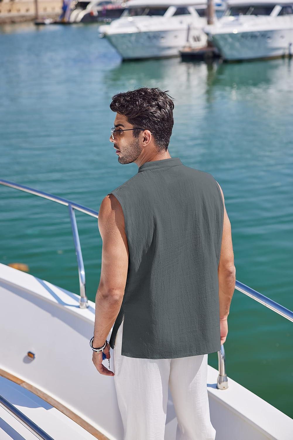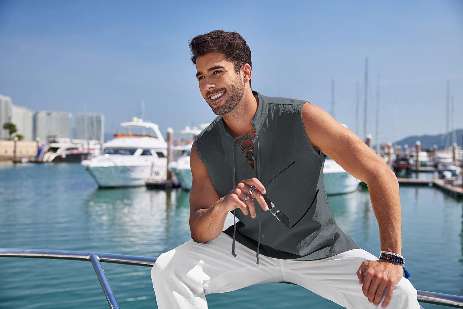 COOFANDY Men’s Cotton Linen Tank Top Shirts Casual Sleeveless Lace Up Beach Hippie Tops Bohemian Renaissance Pirate Tunic(Drak Gray)
