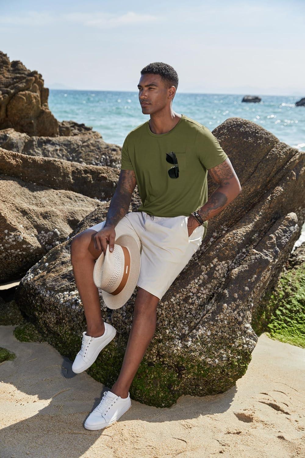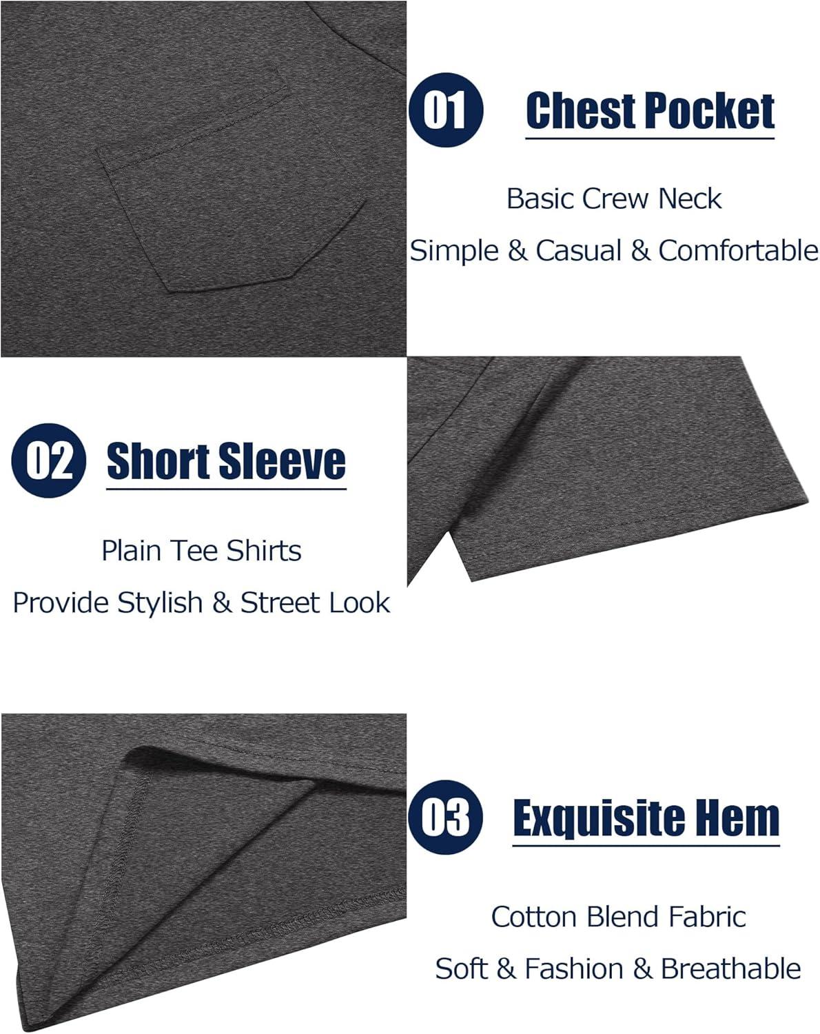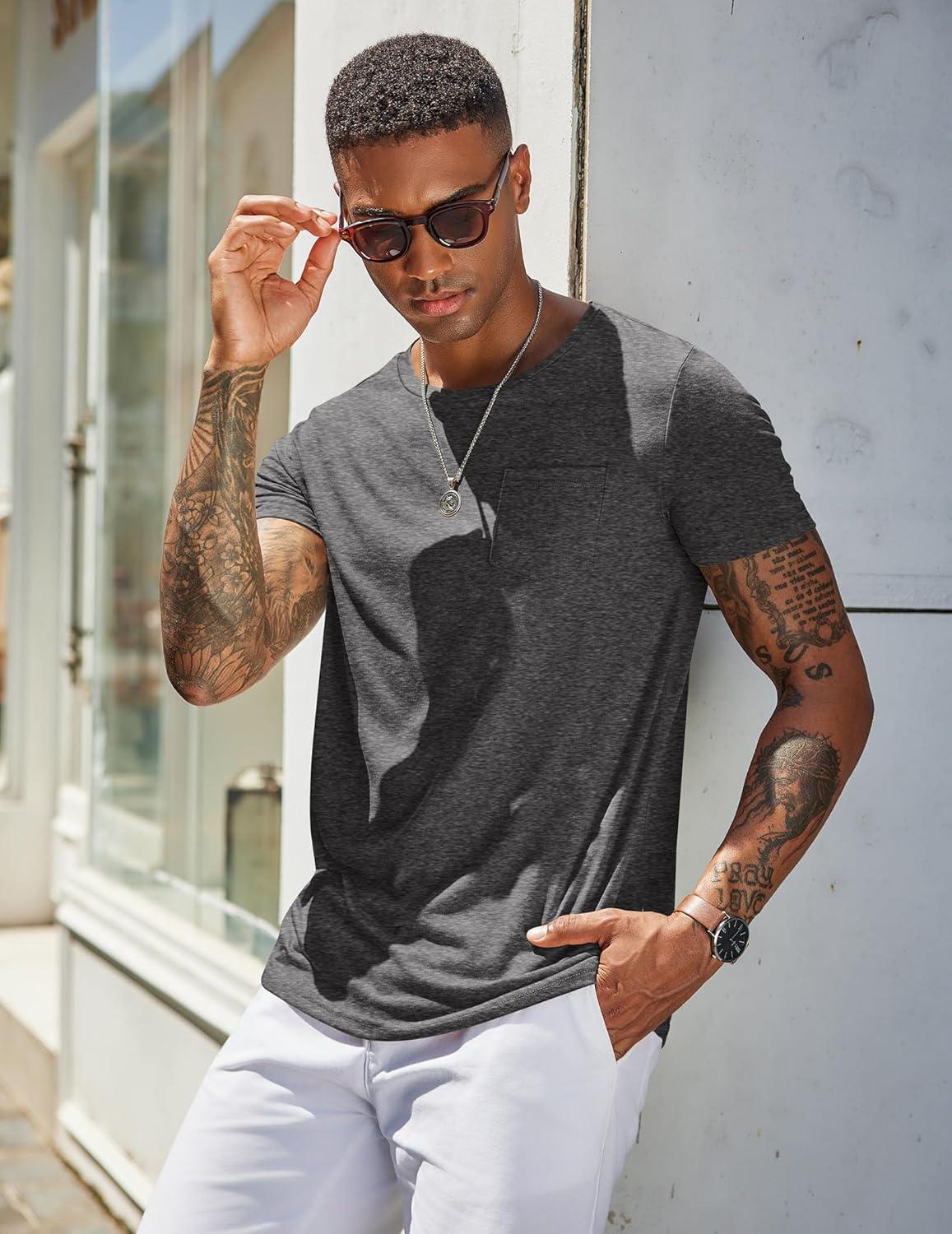 COOFANDY Men’s Cotton Pocket Tee Shirts Soft Crew Neck Stretch T Shirt Plain Casual Short Sleeve Summer Basic Tops(2 Pack(drak Grey+army Green))