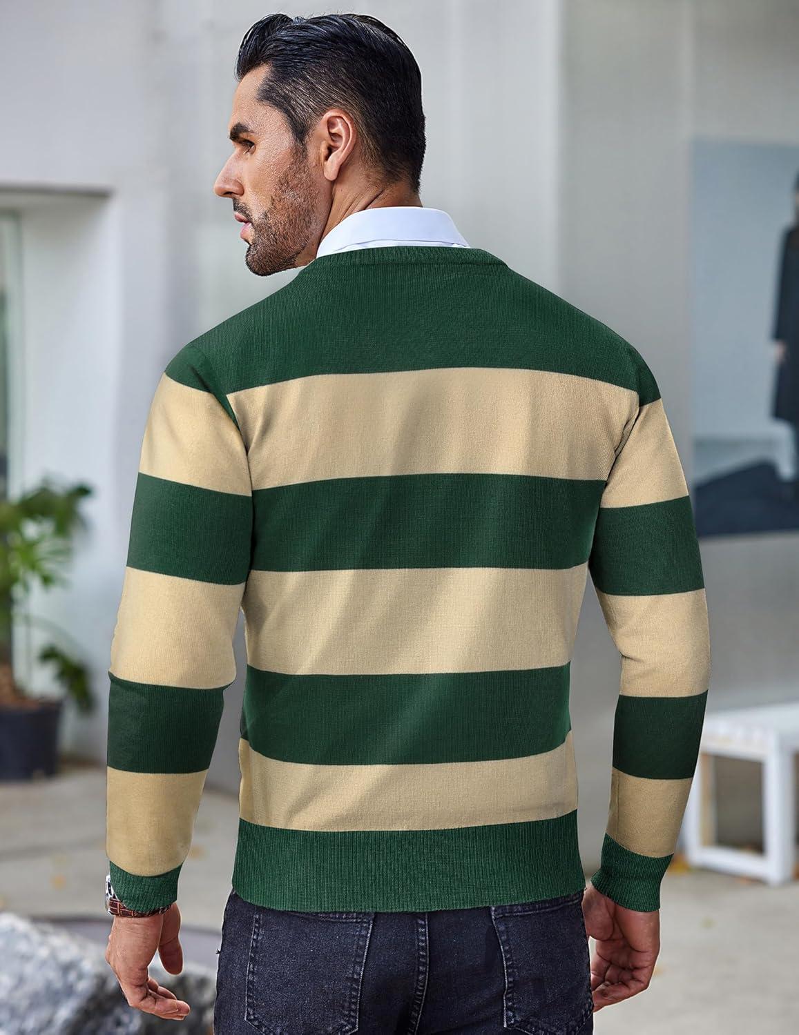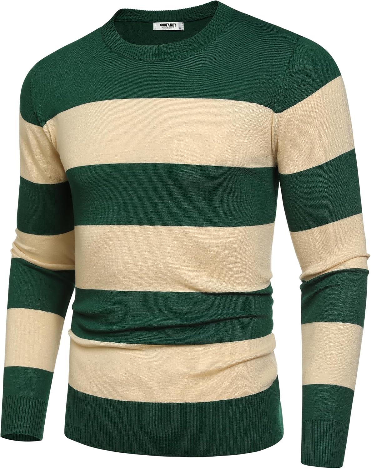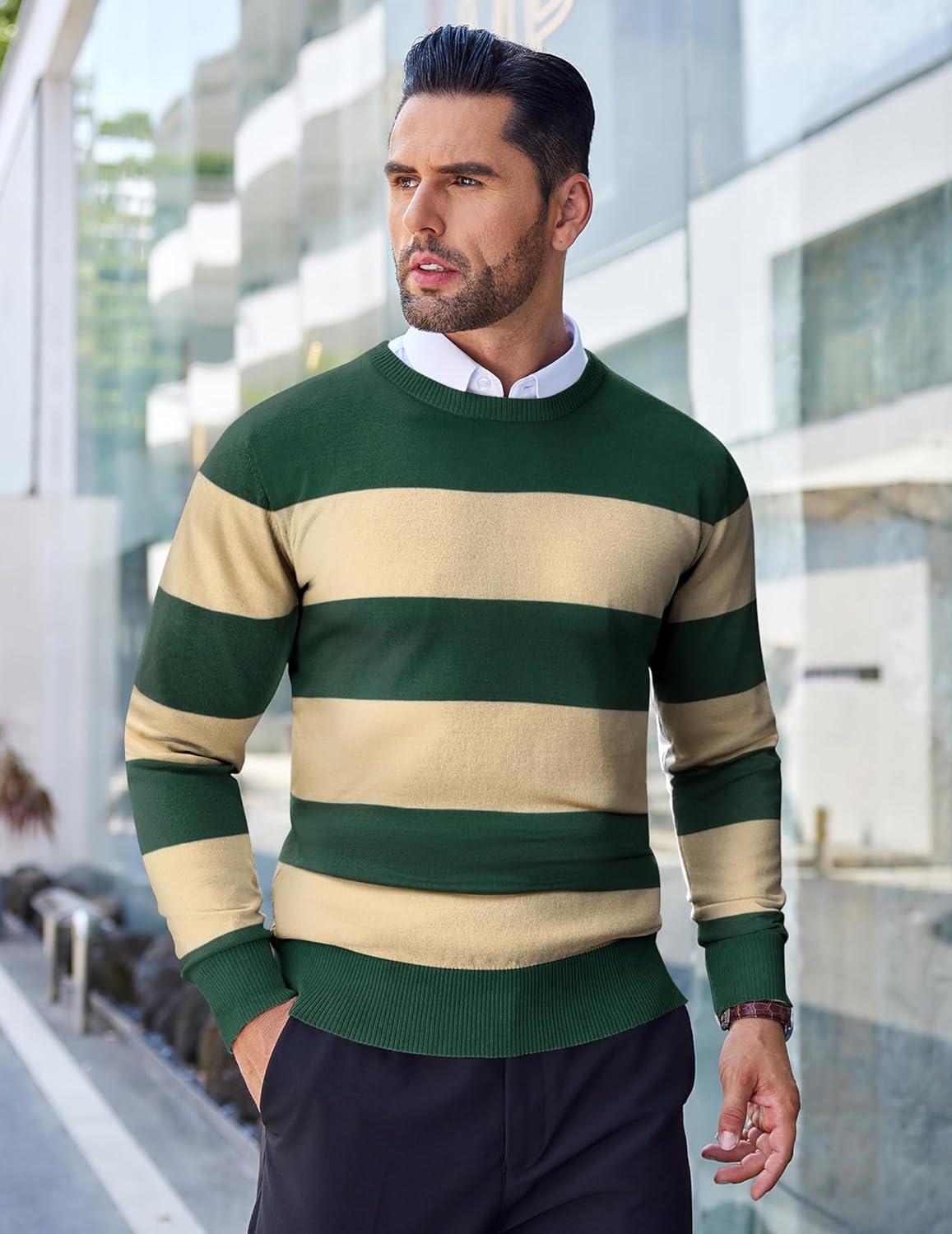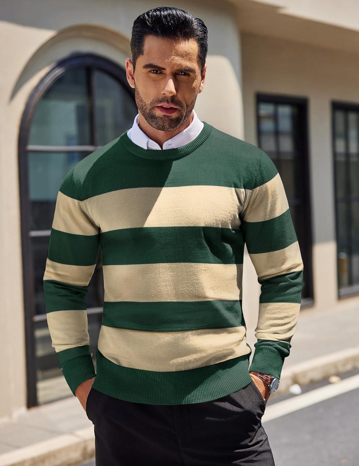 COOFANDY Men’s Crew Neck Sweater Slim Fit Lightweight Sweatshirts Knitted Pullover for Casual Or Dressy Wear(Green/Apricot Stripe)