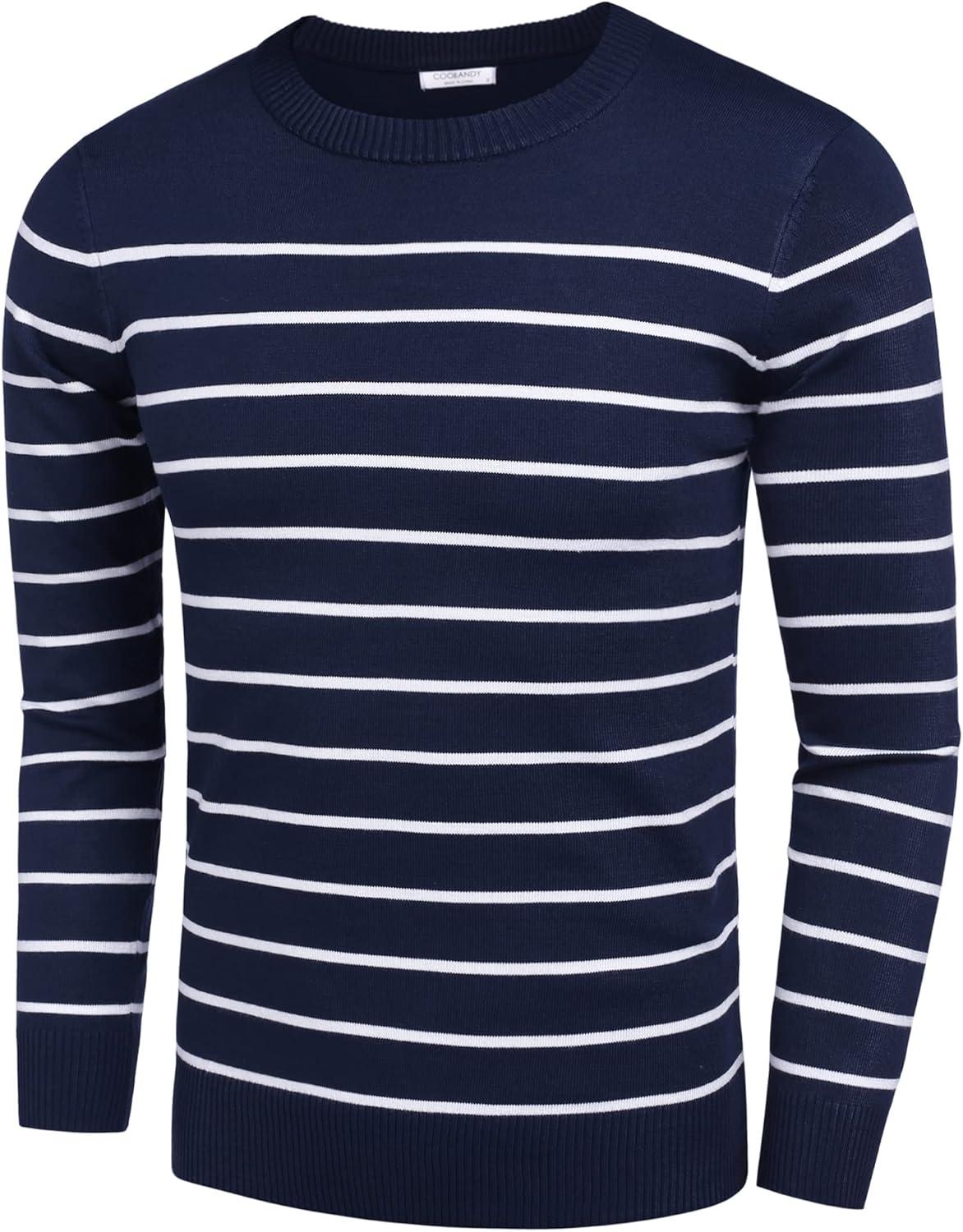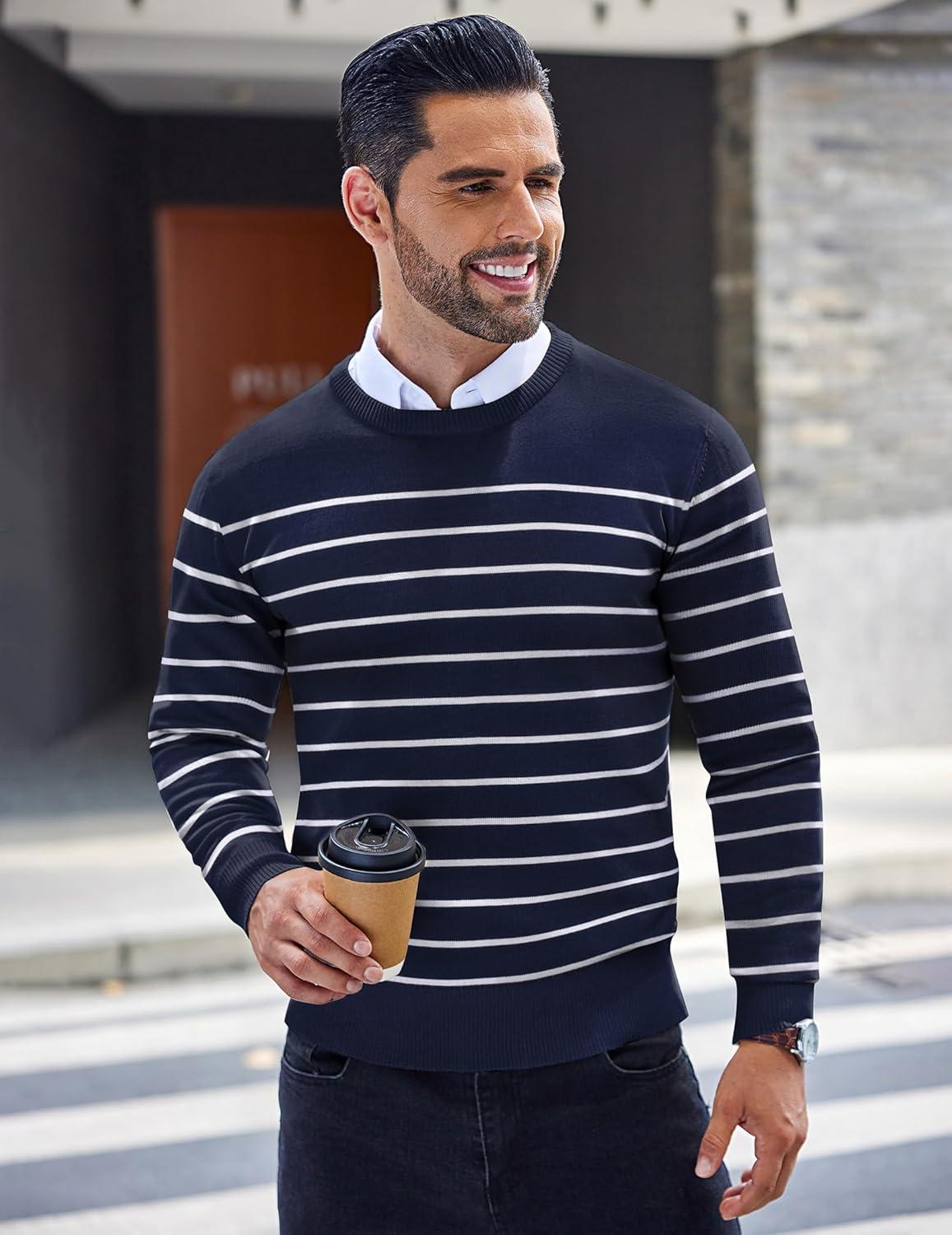 COOFANDY Men’s Crew Neck Sweater Slim Fit Lightweight Sweatshirts Knitted Pullover for Casual Or Dressy Wear(Navy/White Mariner Stripe)
