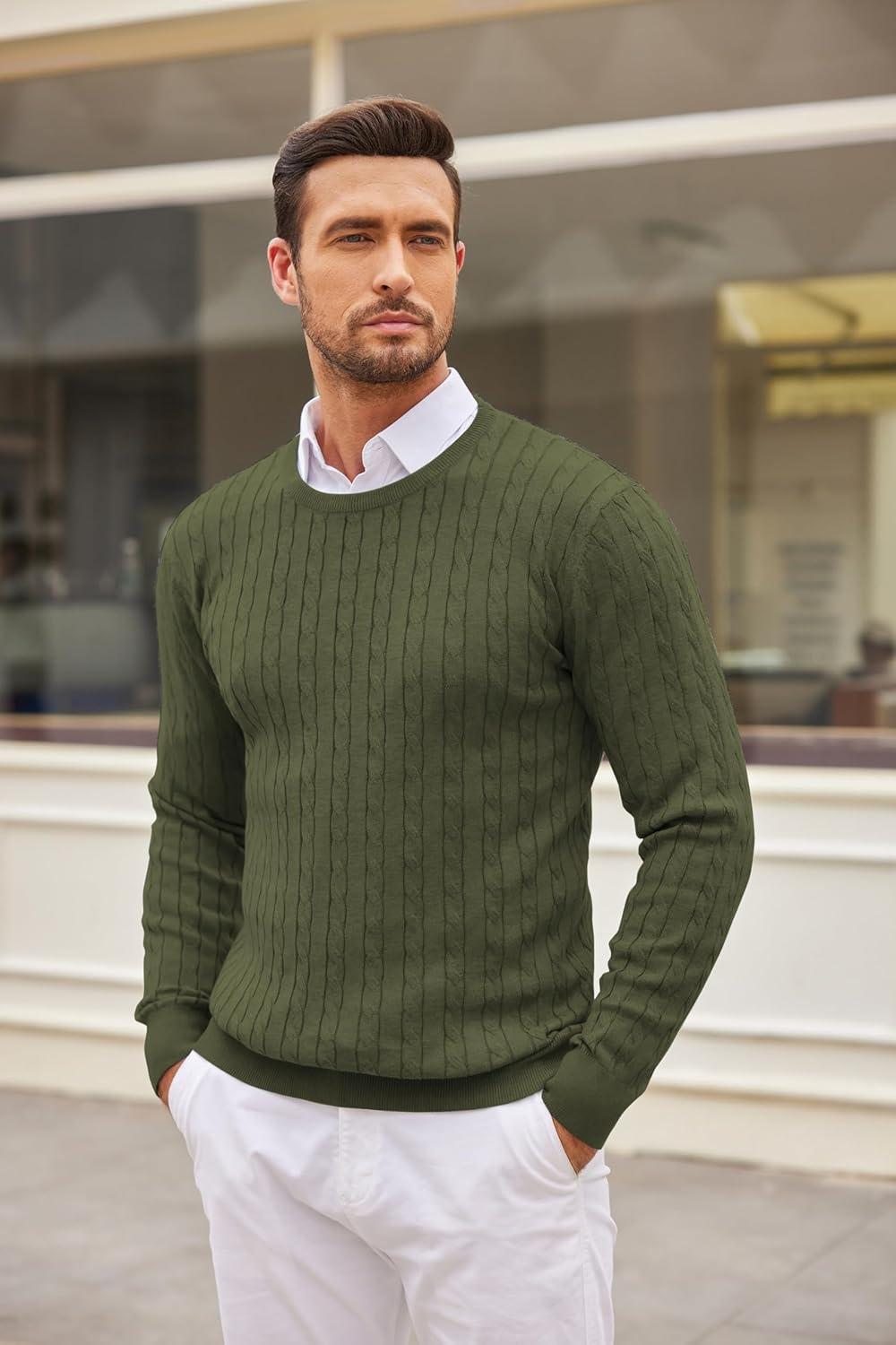 COOFANDY Men’s Crewneck Knit Sweater Slim Fit Lightweight Casual Twist Patterned Cable Knitted Pullover(A-armygreen)