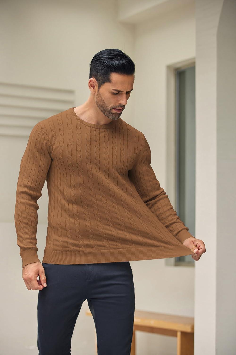 COOFANDY Men’s Crewneck Knit Sweater Slim Fit Lightweight Casual Twist Patterned Cable Knitted Pullover(A-brown)