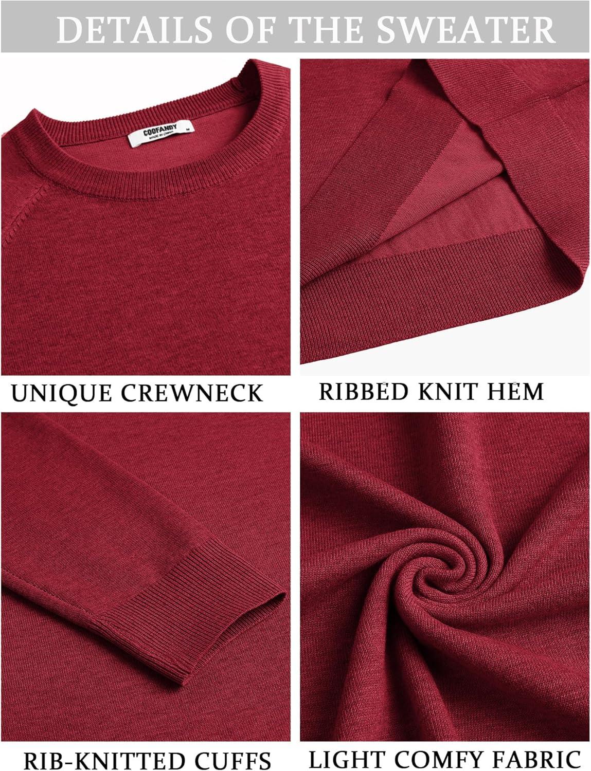 COOFANDY Men’s Crewneck Sweater Casual Dress Pullover Sweaters Slim Fit Lightweight Long Sleeve Raglan Sweaters(Red)