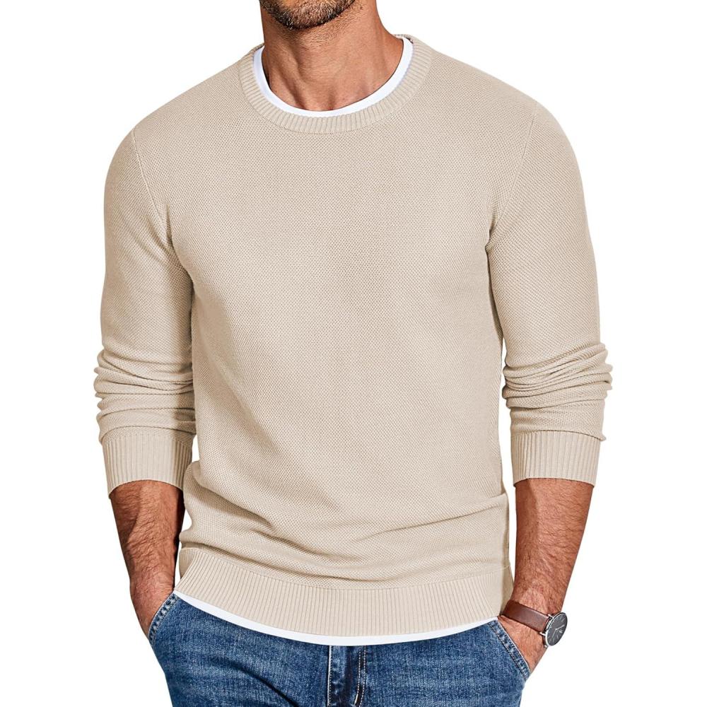 COOFANDY Mens Crewneck Sweater Slim Fit Lightweight Knit Pullover Casual Dress Crew Neck Pullover Sweaters(Light Khaki)
