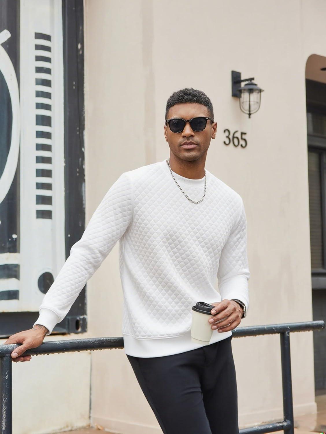 COOFANDY Men’s Crewneck Sweatshirt Geometric Texture Casual Long Sleeve Sweatshirts Fashion Pullover Shirts(White)