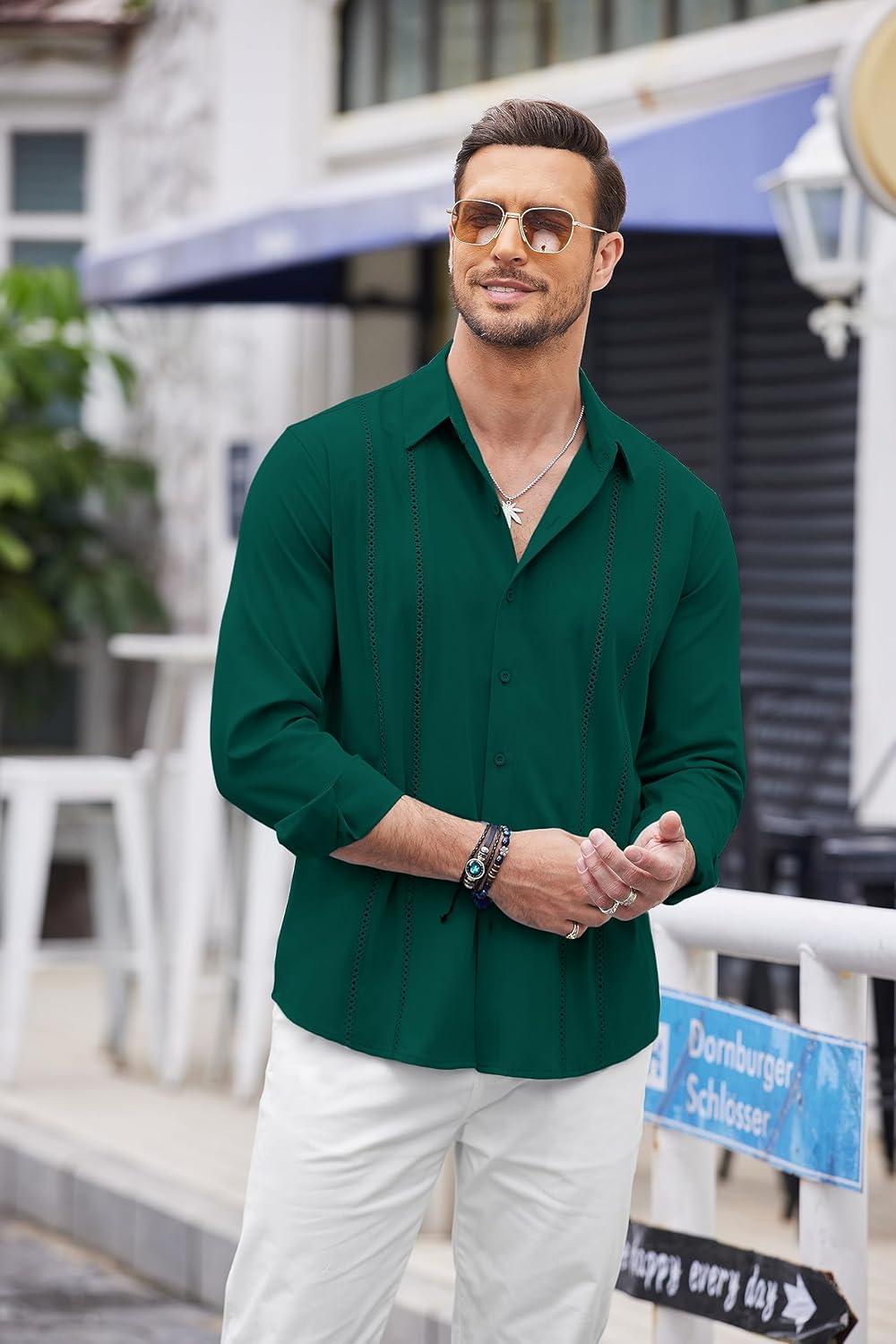 COOFANDY Mens Cuban Guayabera Shirt Casual Button Down Shirts Long Sleeve Summer Beach Shirts(Dark Green)