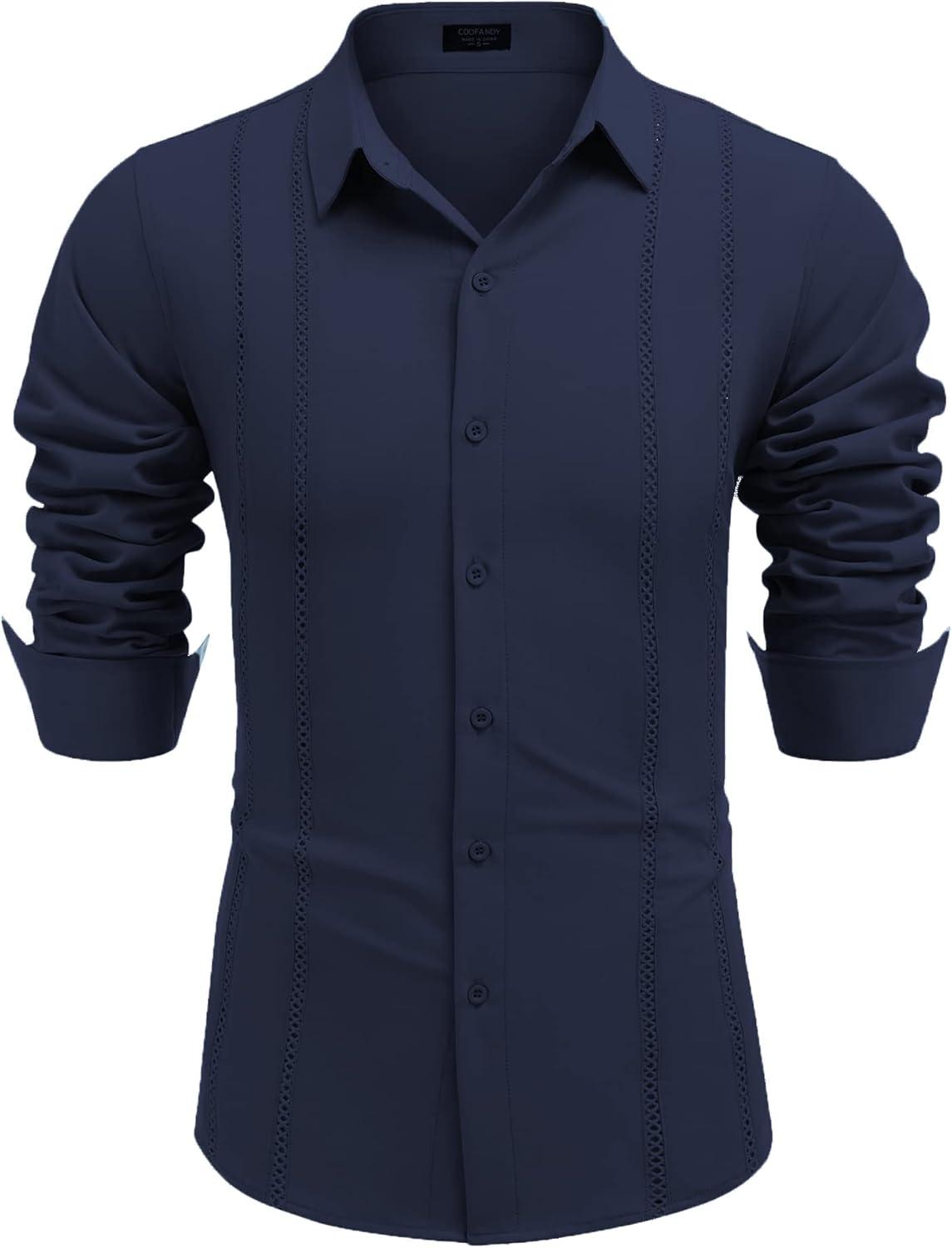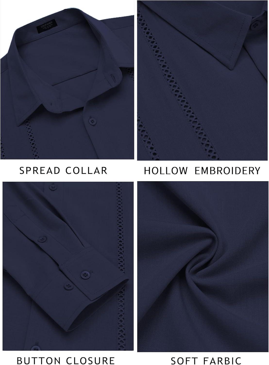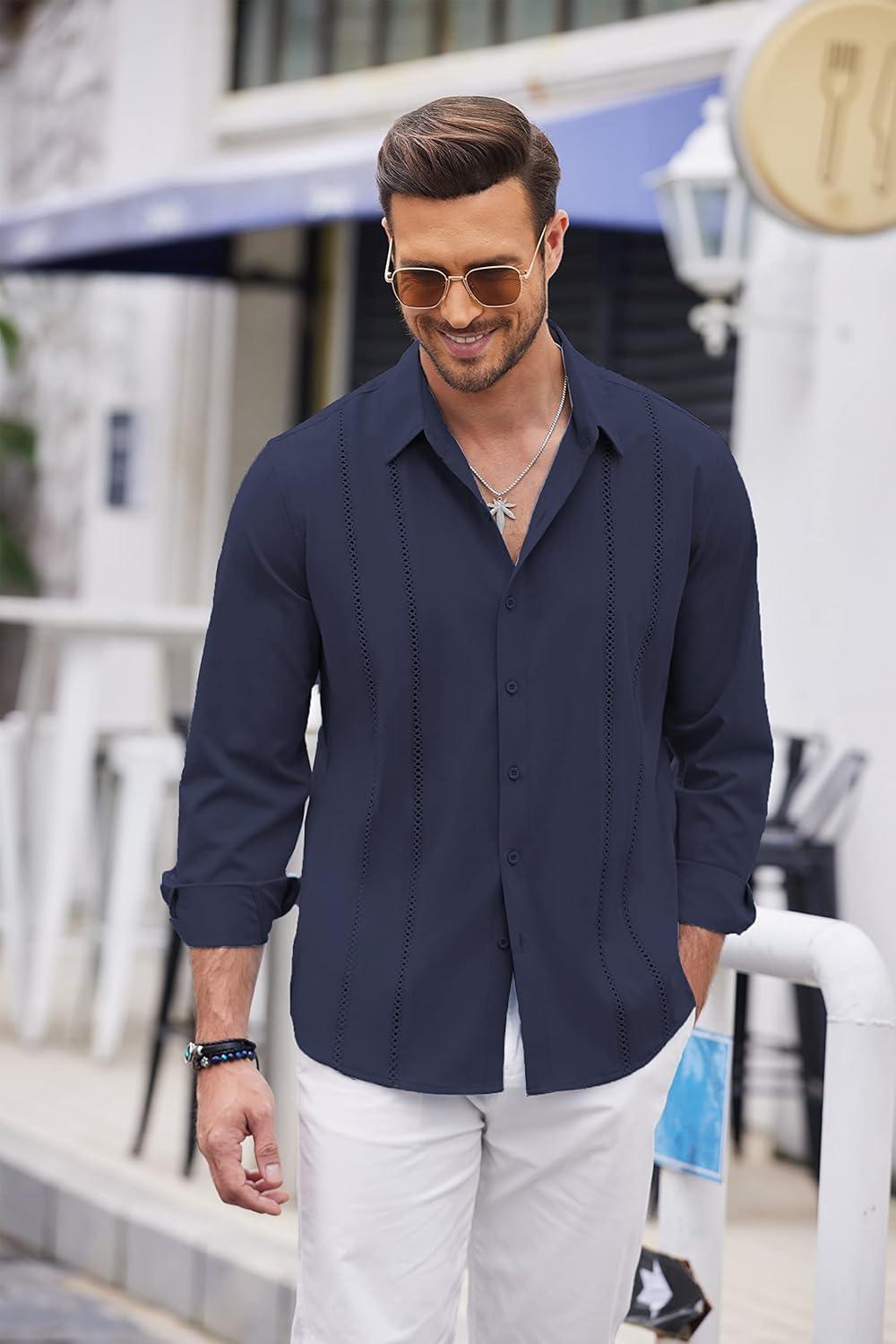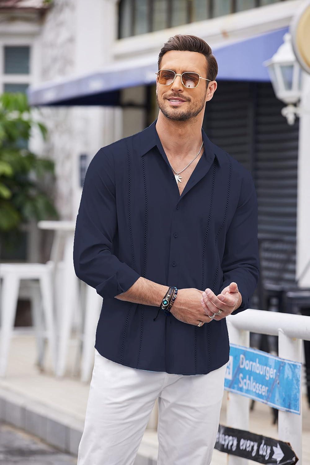 COOFANDY Mens Cuban Guayabera Shirt Casual Button Down Shirts Long Sleeve Summer Beach Shirts(Navy Blue)