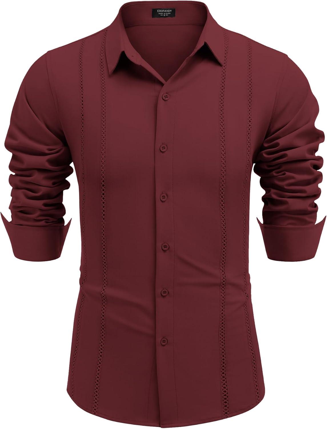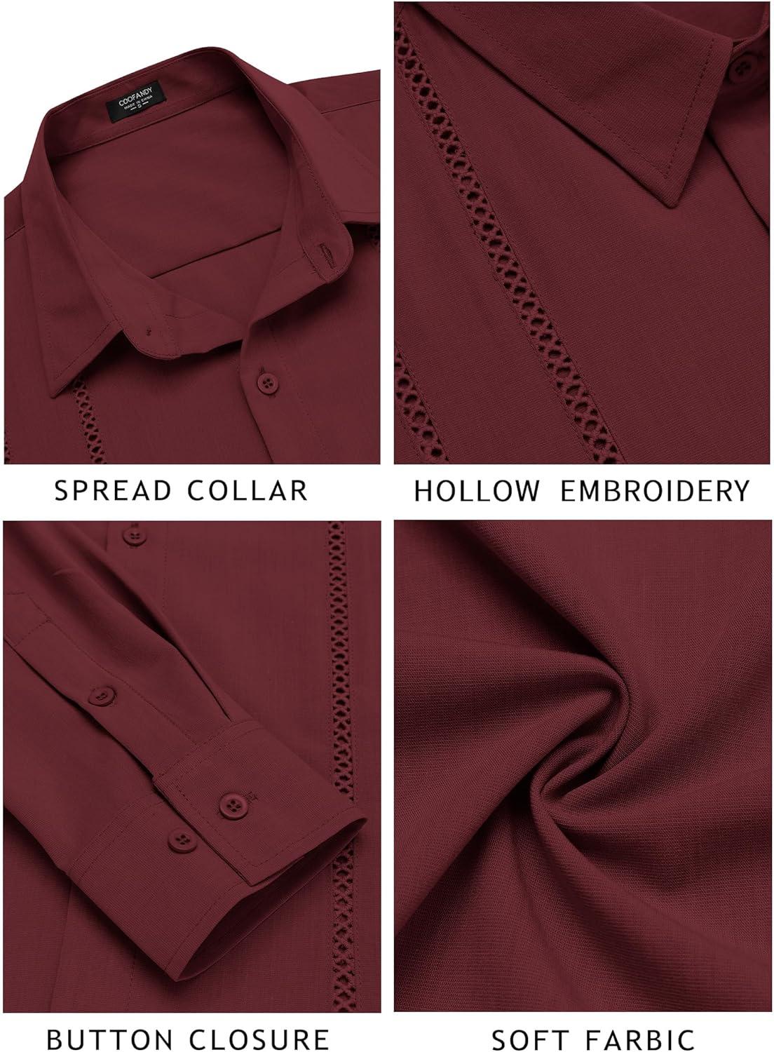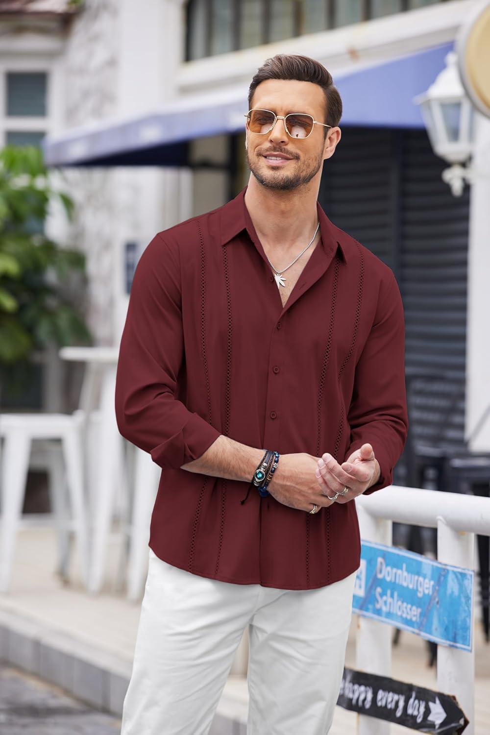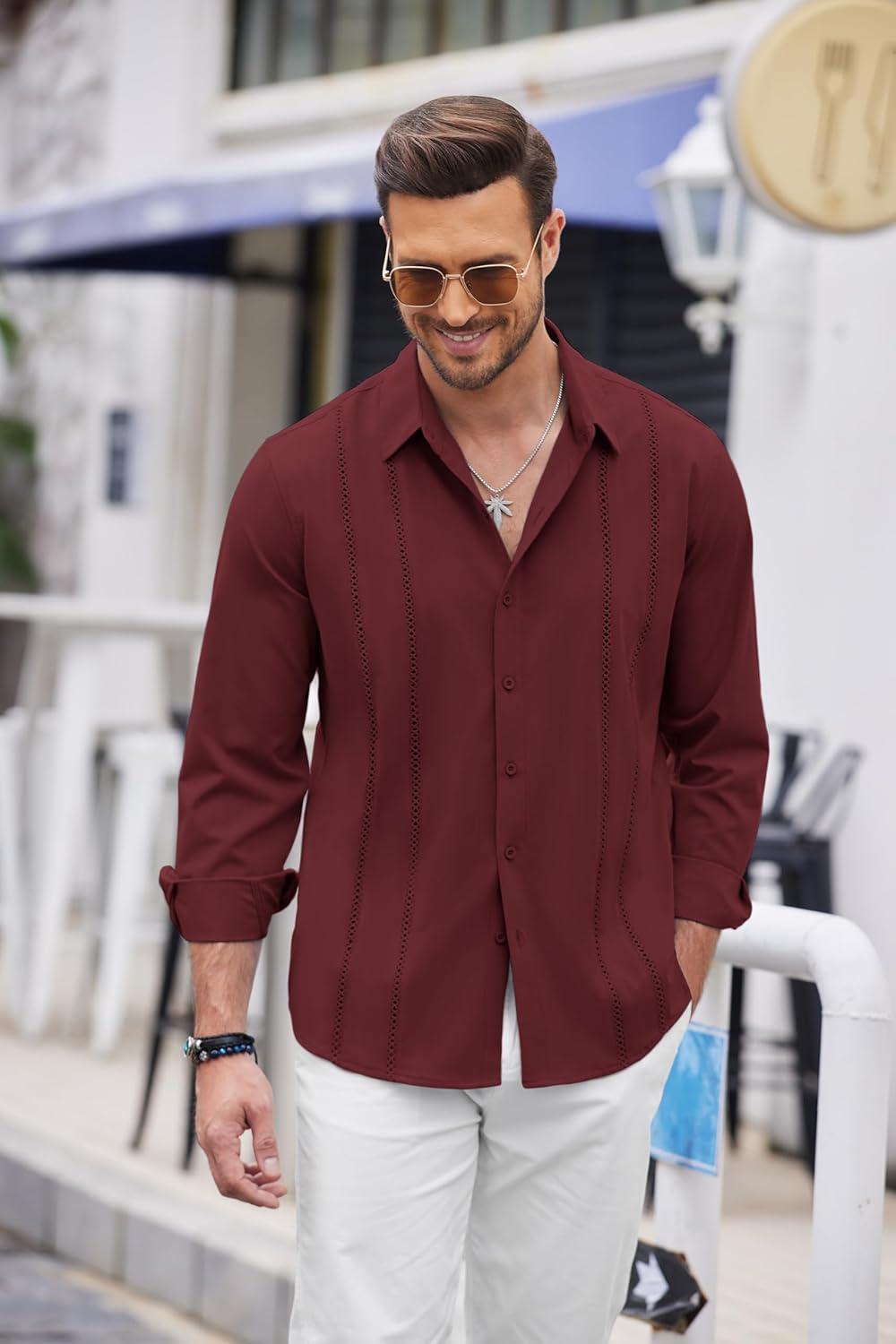 COOFANDY Mens Cuban Guayabera Shirt Casual Button Down Shirts Long Sleeve Summer Beach Shirts(Wine Red)