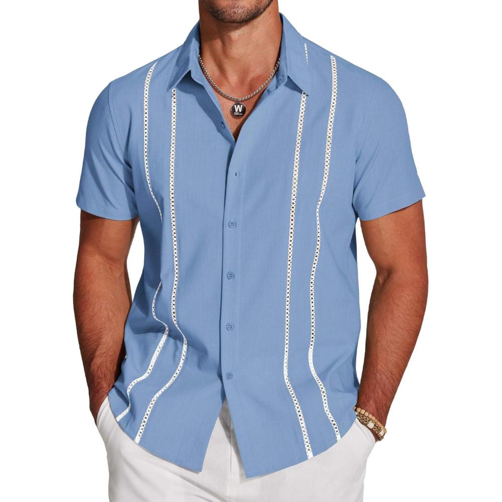 COOFANDY Men’s Cuban Guayabera Shirt Short Sleeve Button Down Shirts Casual Summer Beach Linen Shirts(Blue-white Webbing)