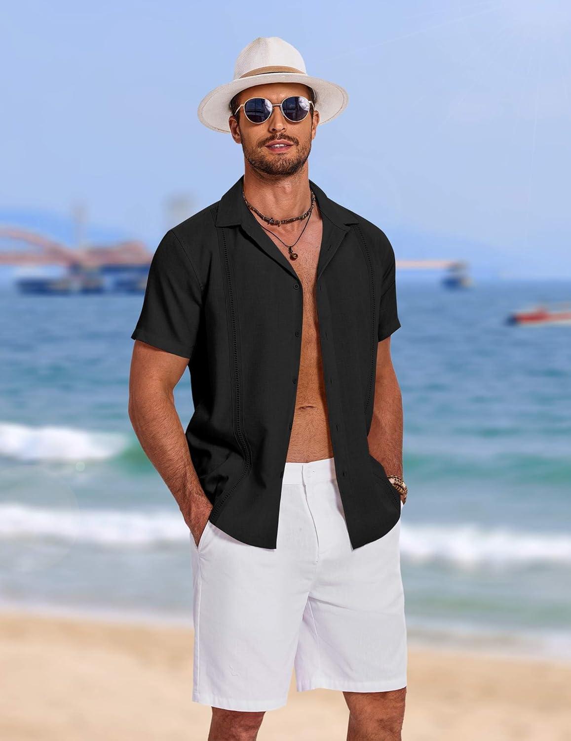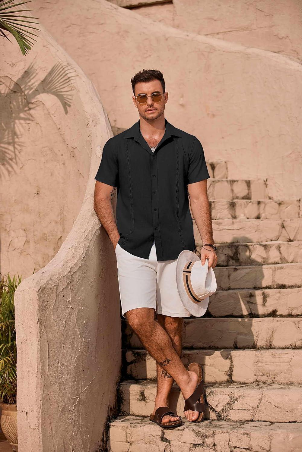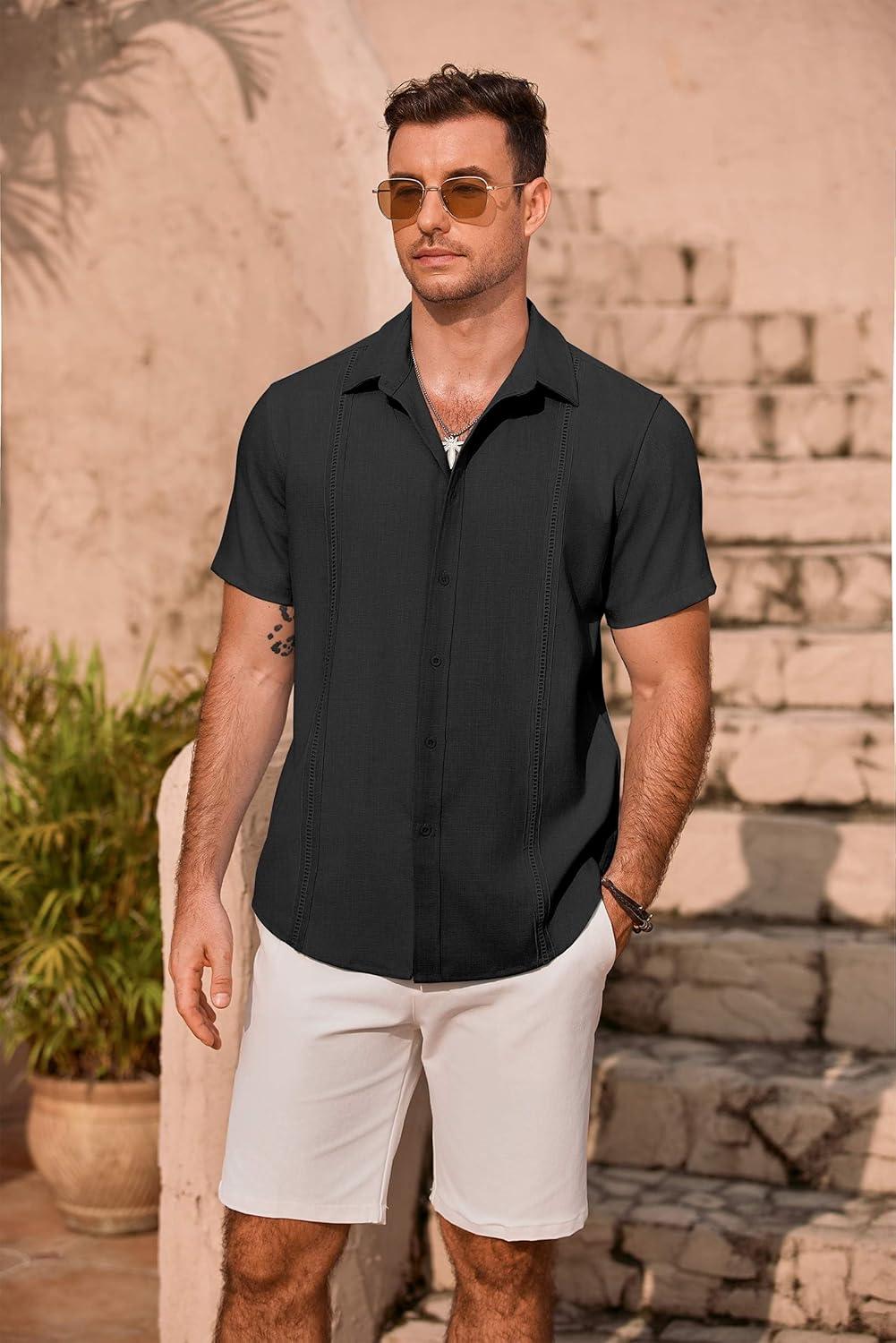 COOFANDY Mens Cuban Guayabera Shirt Short Sleeve Button Down Shirts Summer Beach Vacation Shirts(A-black)