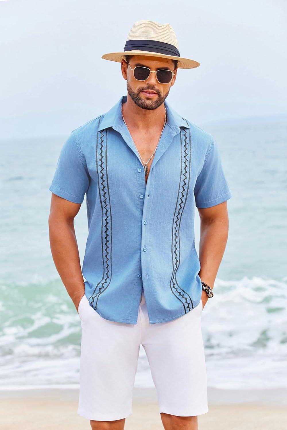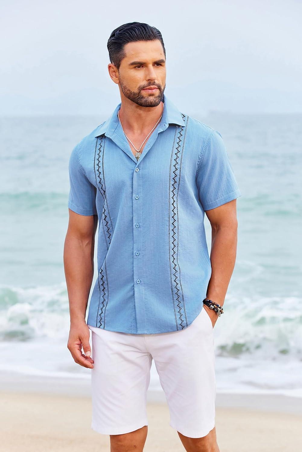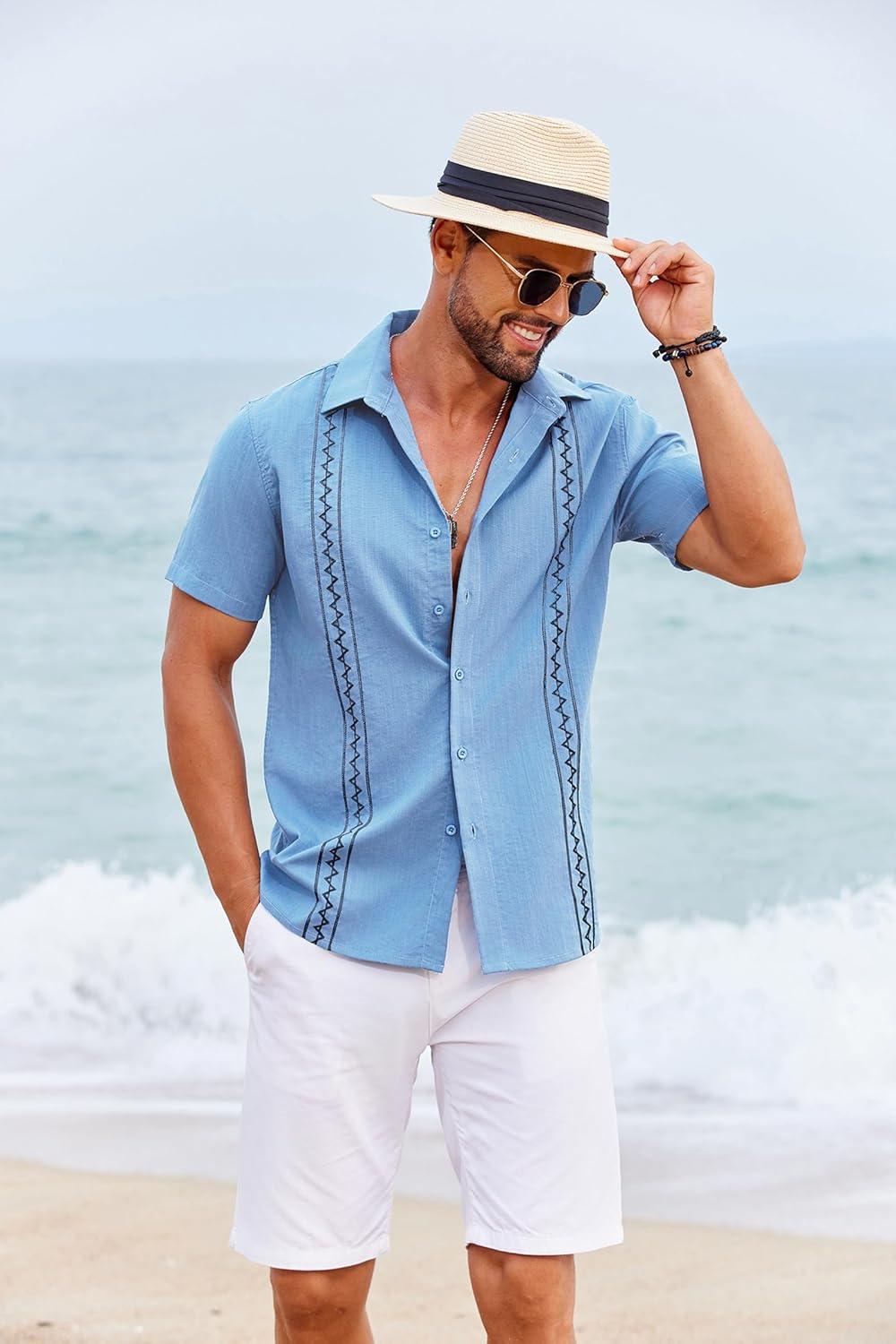 COOFANDY Mens Cuban Guayabera Shirt Short Sleeve Button Down Shirts Summer Beach Vacation Shirts(Light Blue)