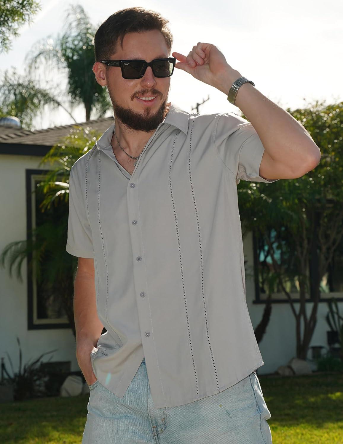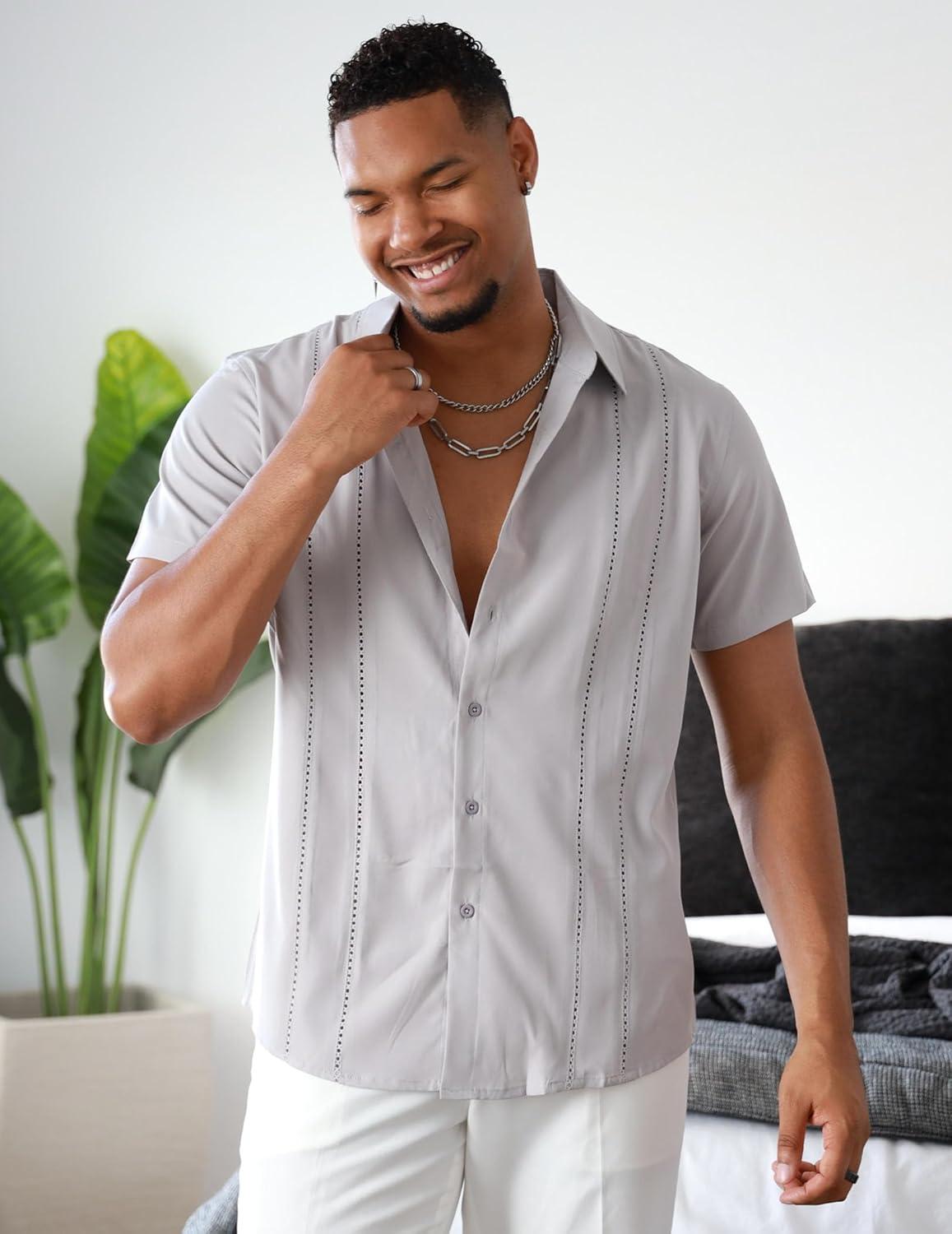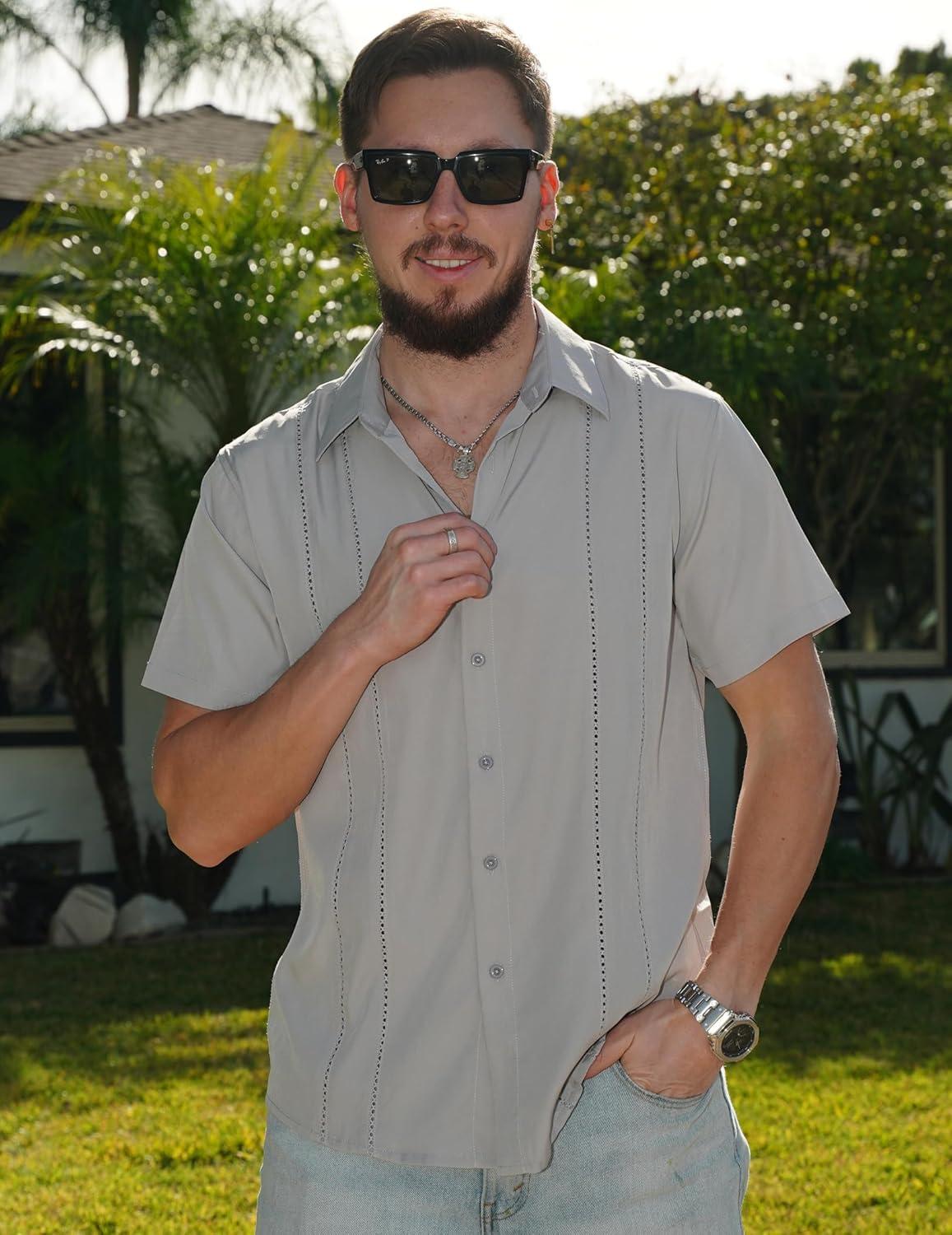 COOFANDY Mens Cuban Guayabera Shirt Short Sleeve Button Down Shirts Summer Beach Vacation Shirts(Light Gray)