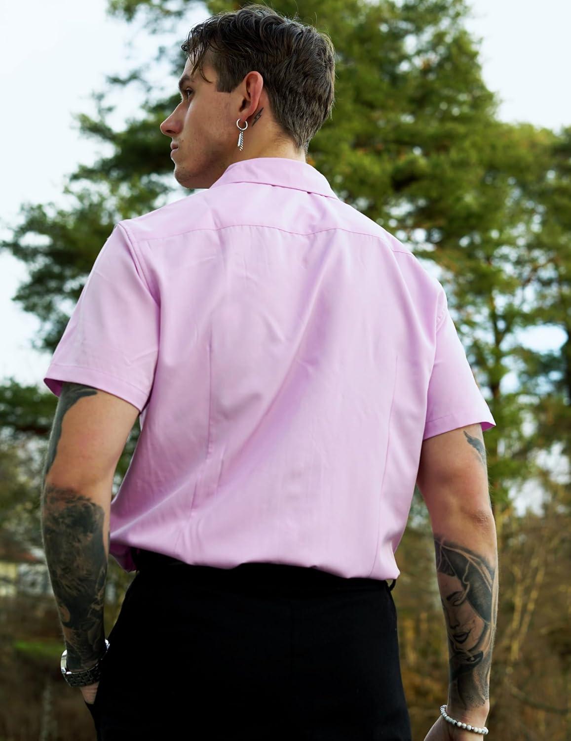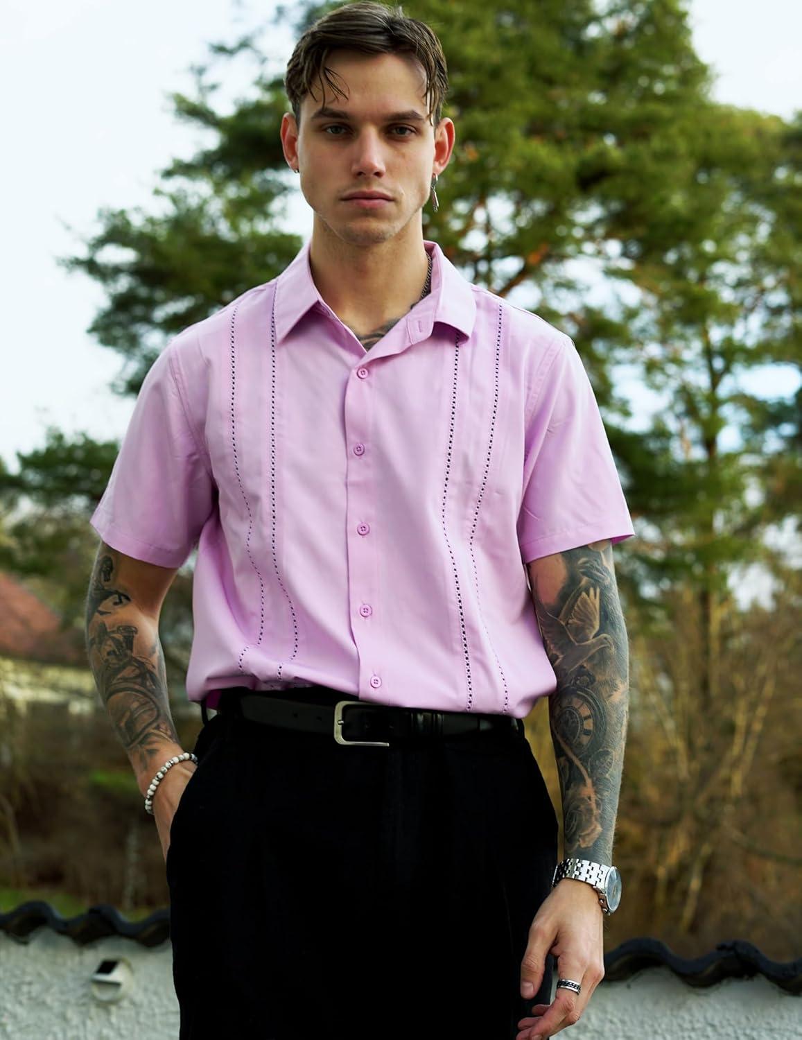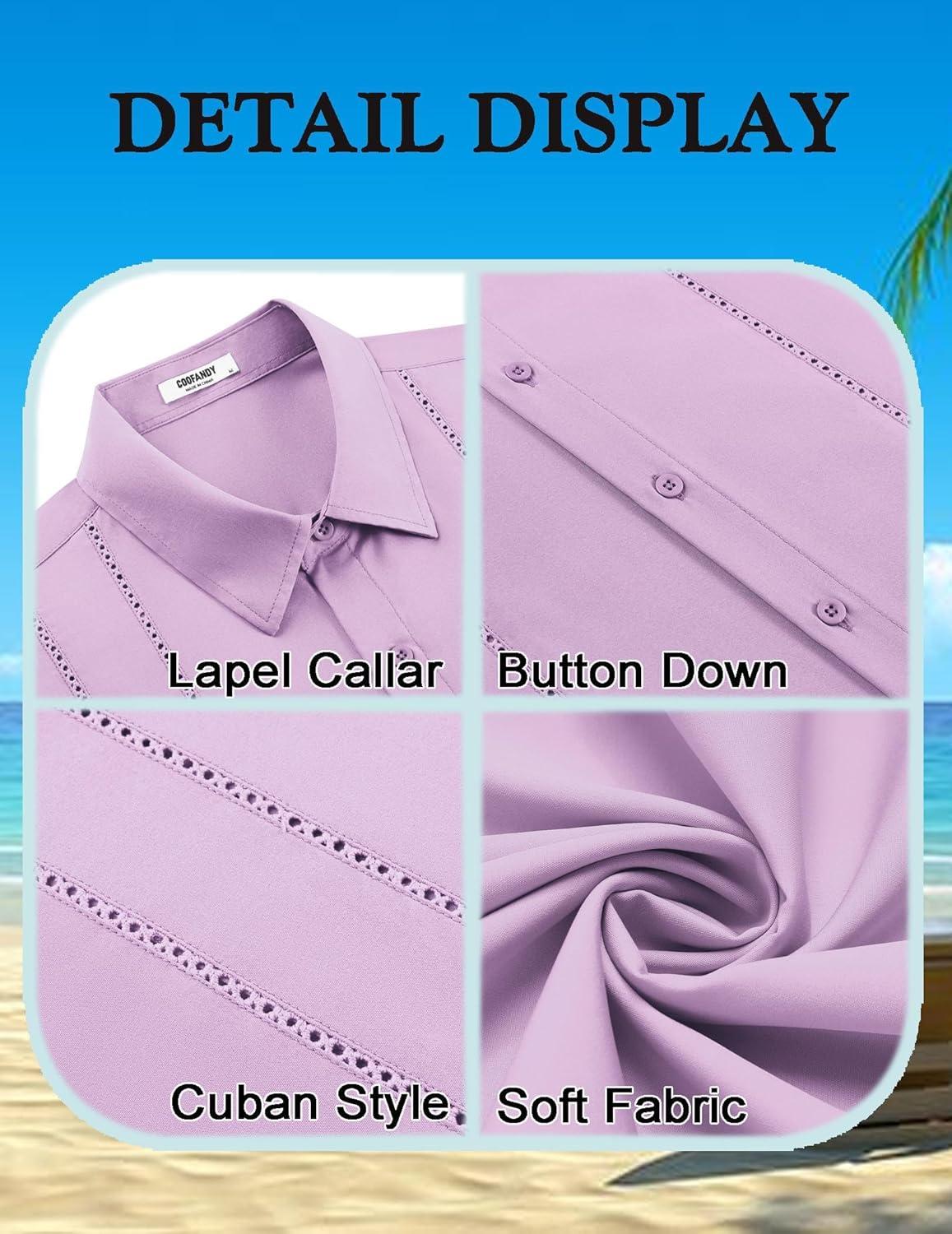 COOFANDY Mens Cuban Guayabera Shirt Short Sleeve Button Down Shirts Summer Beach Vacation Shirts(Light Purple)