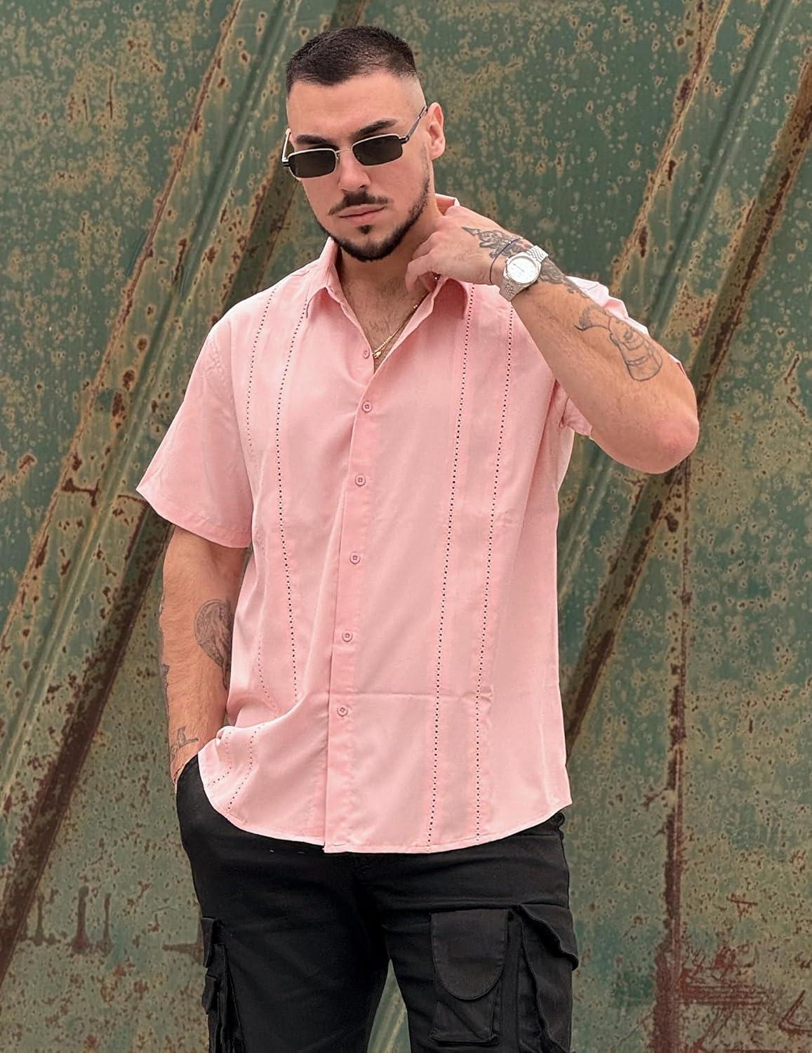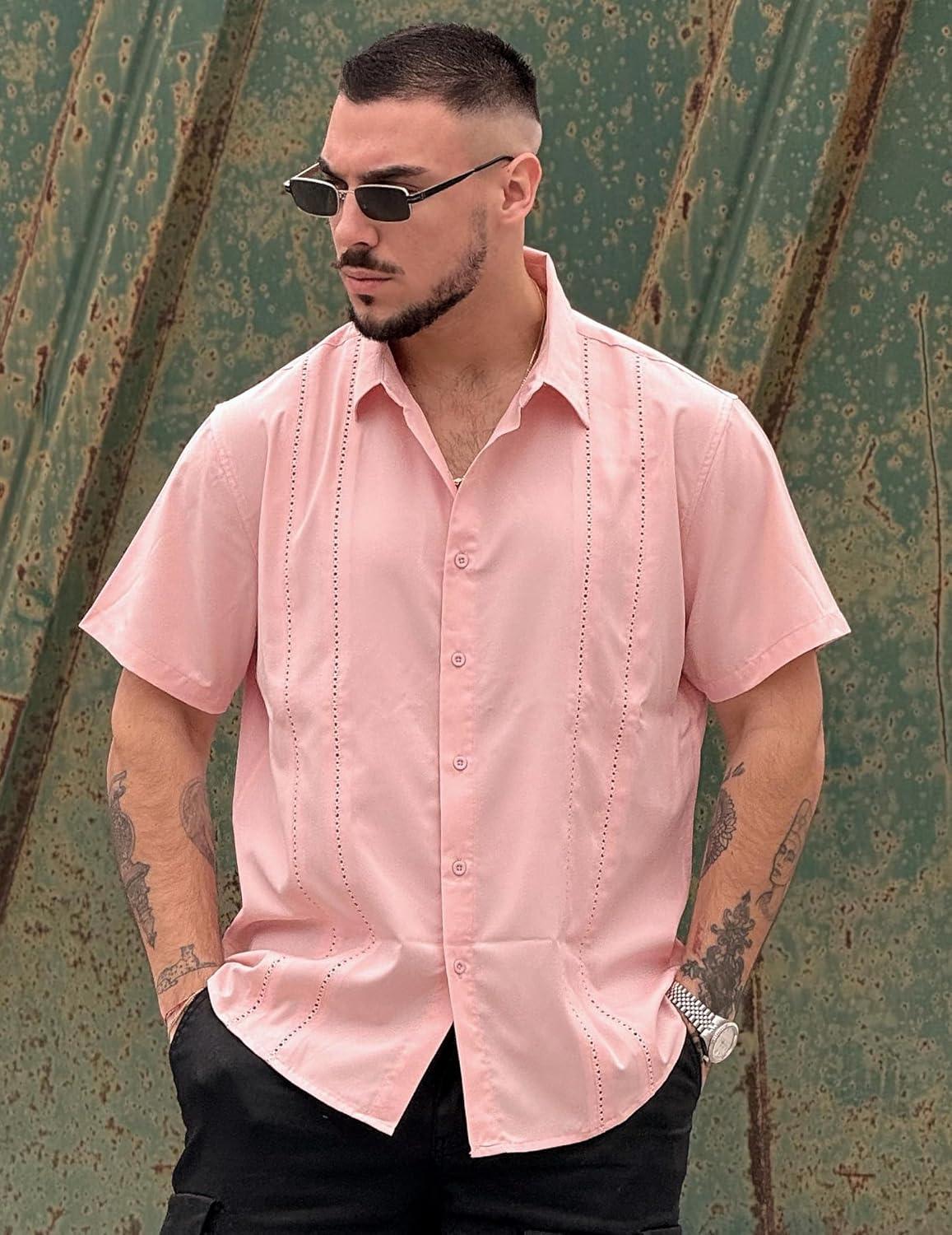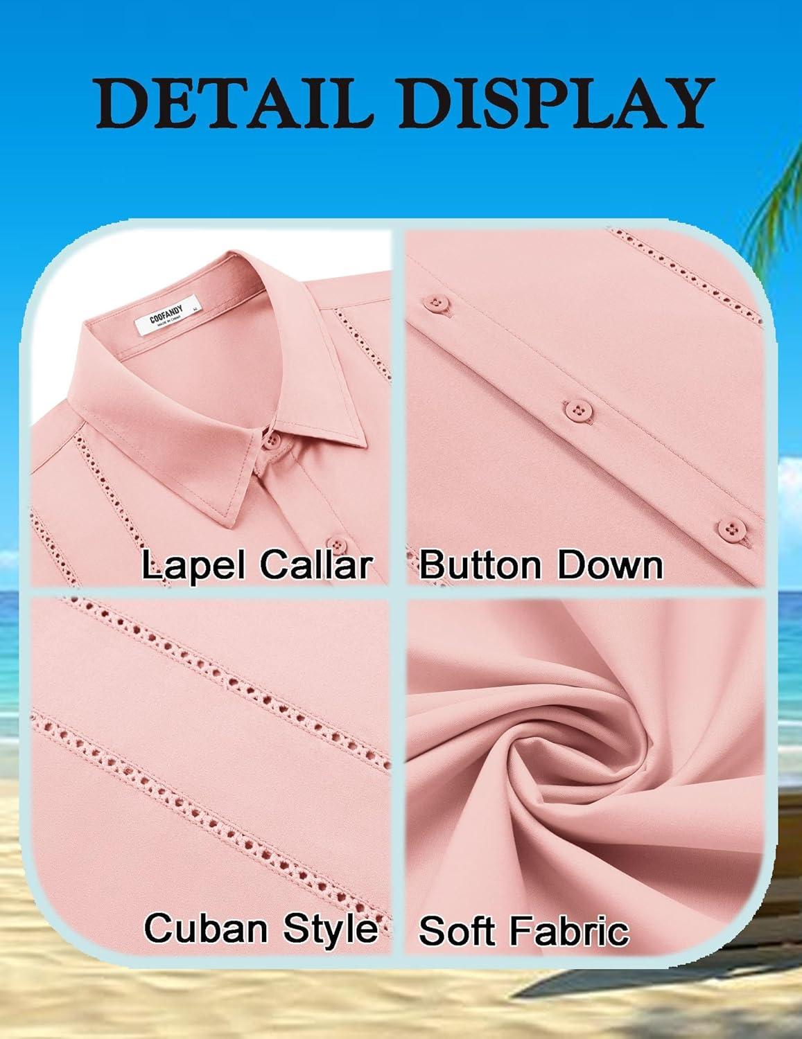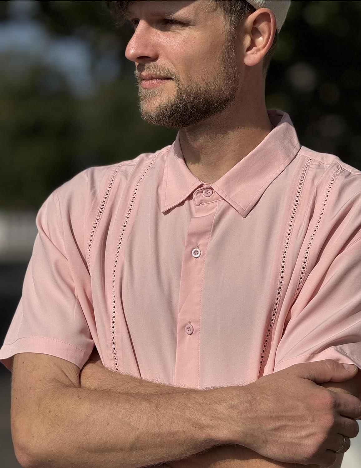 COOFANDY Mens Cuban Guayabera Shirt Short Sleeve Button Down Shirts Summer Beach Vacation Shirts(Pink)