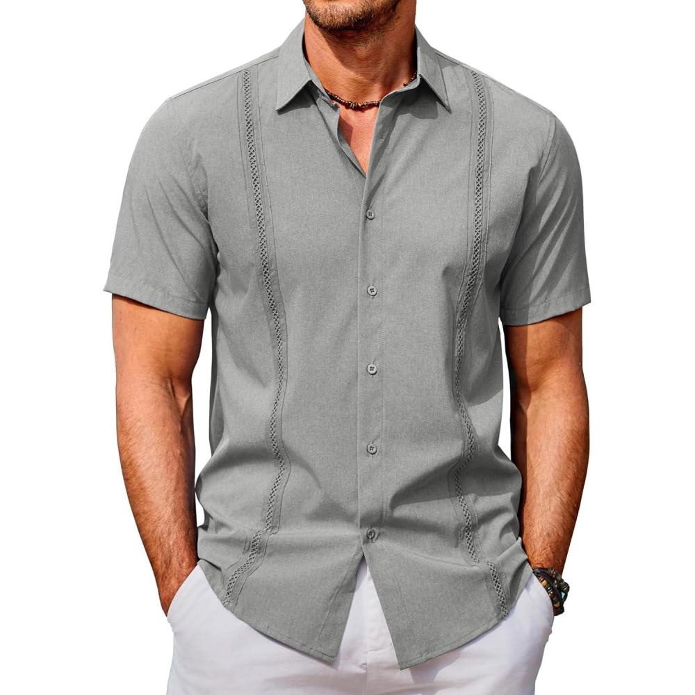 COOFANDY Men’s Cuban Guayabera Shirts Casual Short Sleeve Button Down Shirt Summer Beach Vacation Shirt(Light Grey)