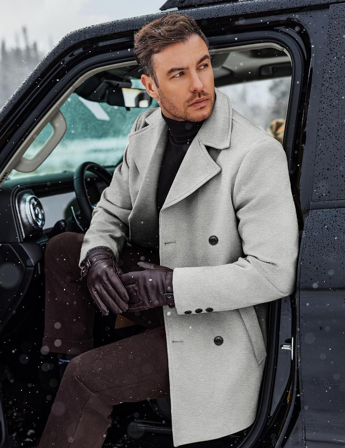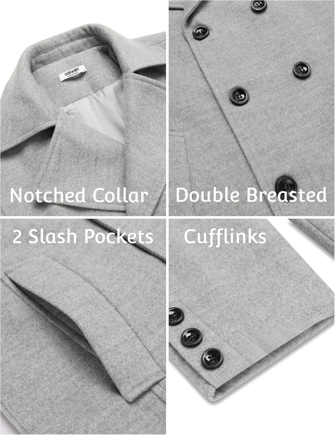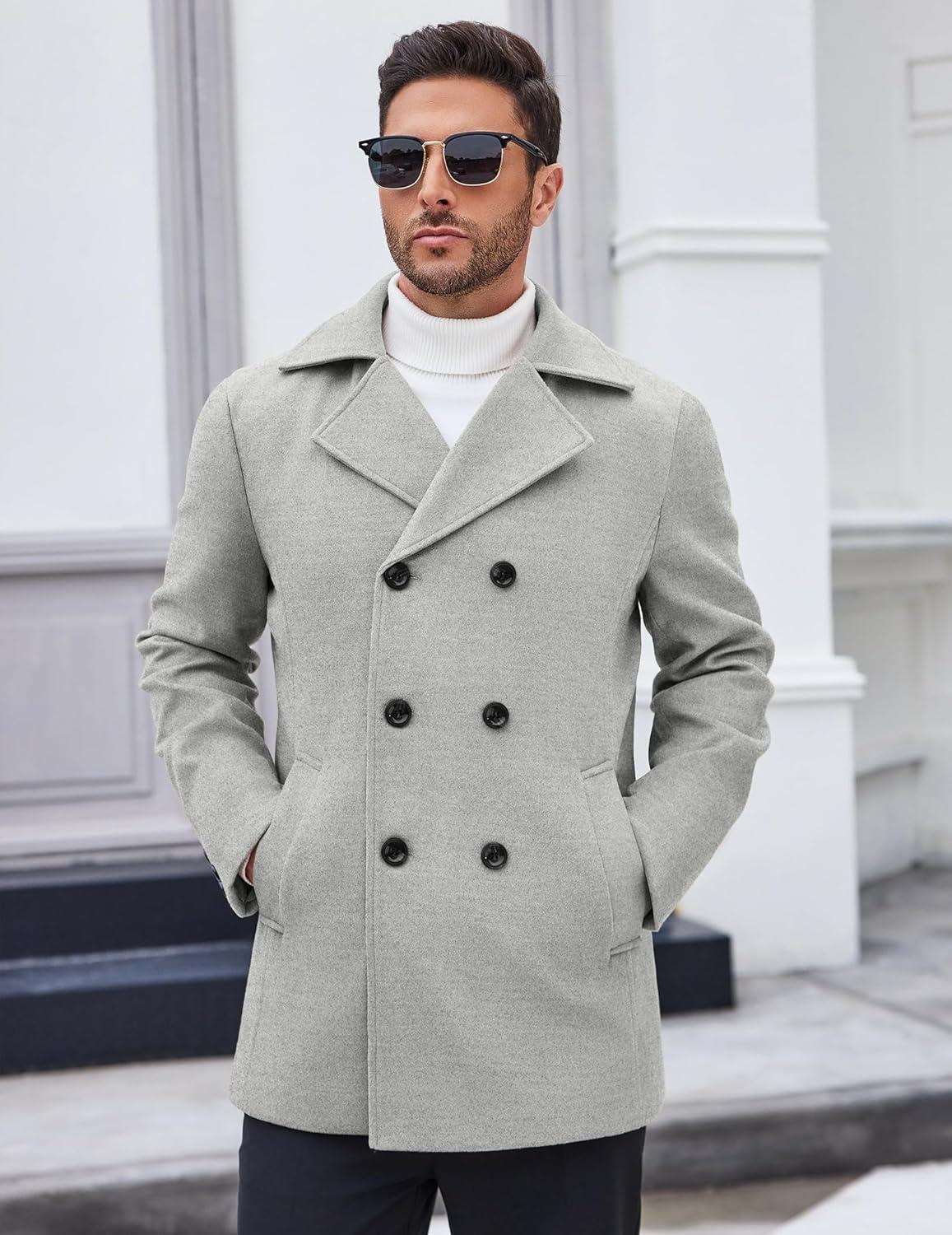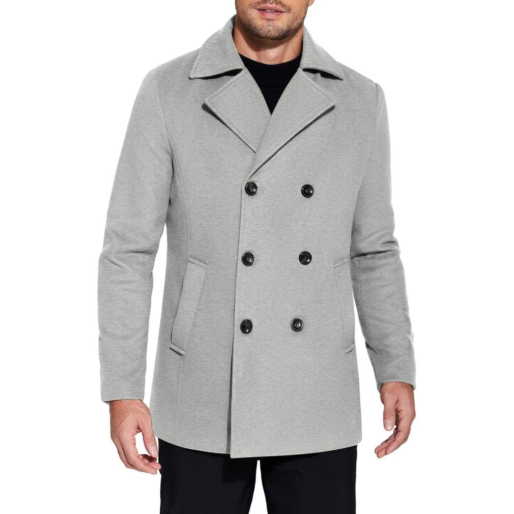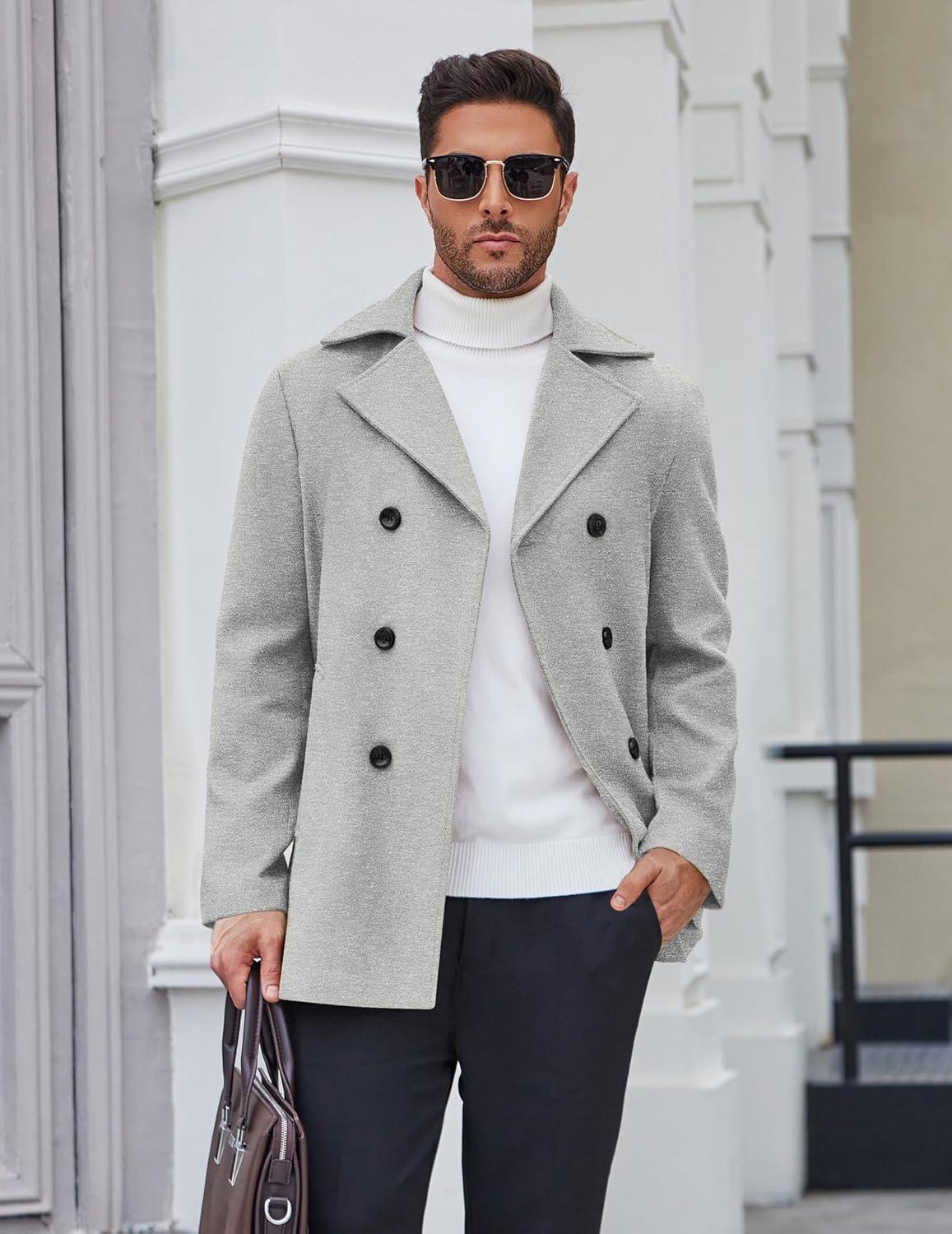 COOFANDY Men’s Double Breasted Pea Coat Winter Overcoat Short Trench Coat Notched Collar(Light Grey)
