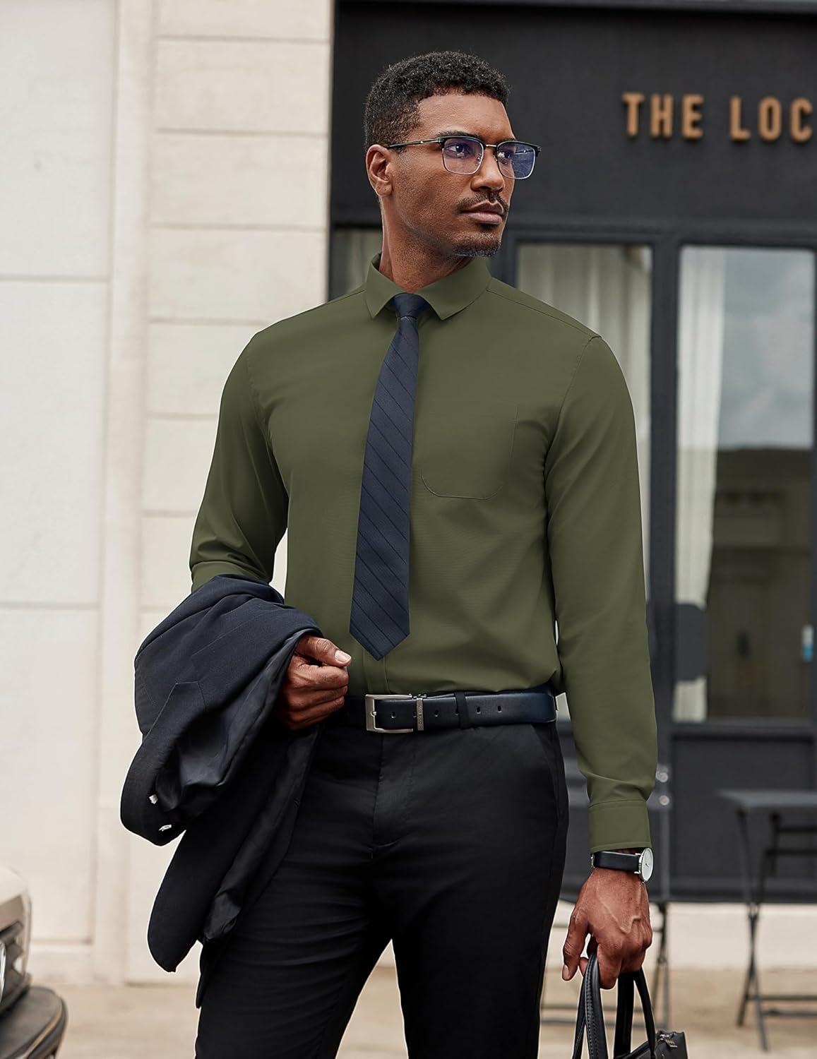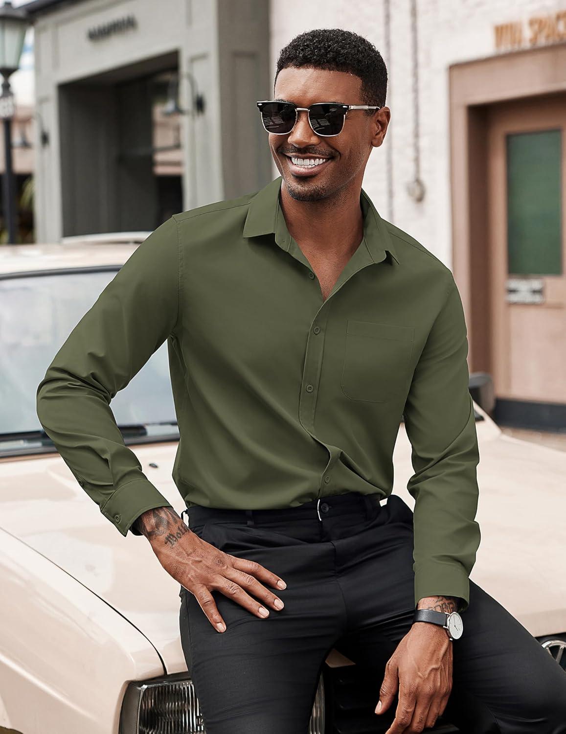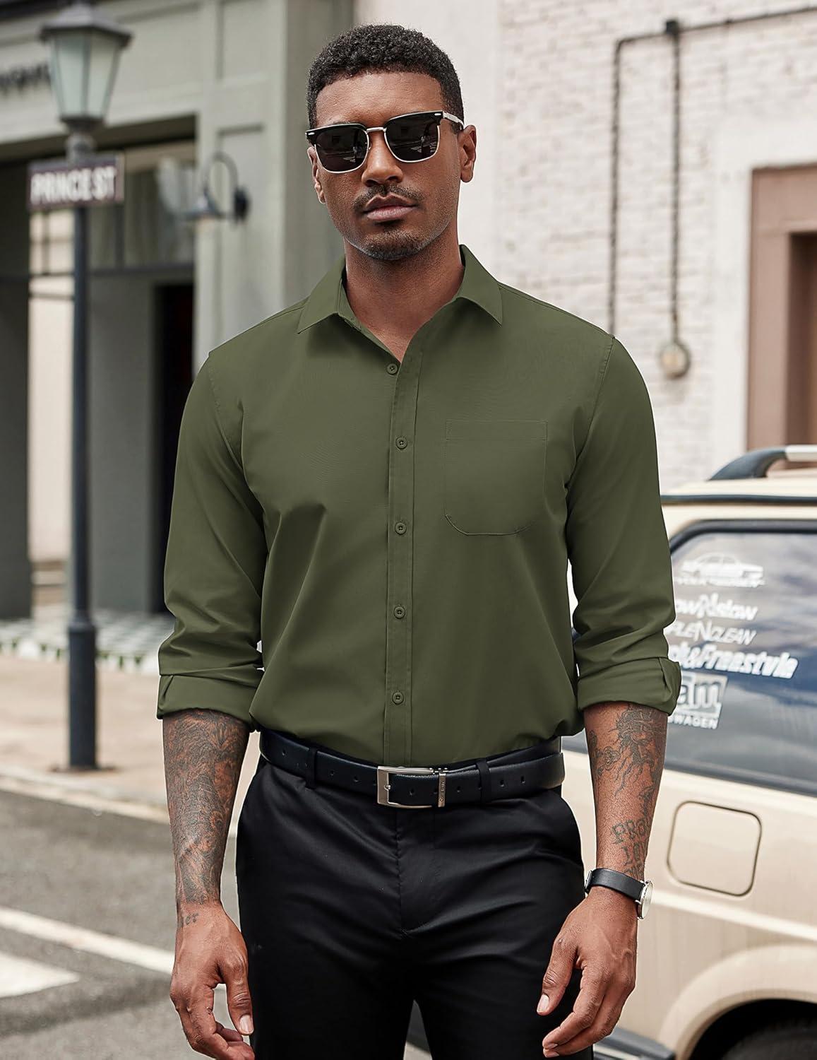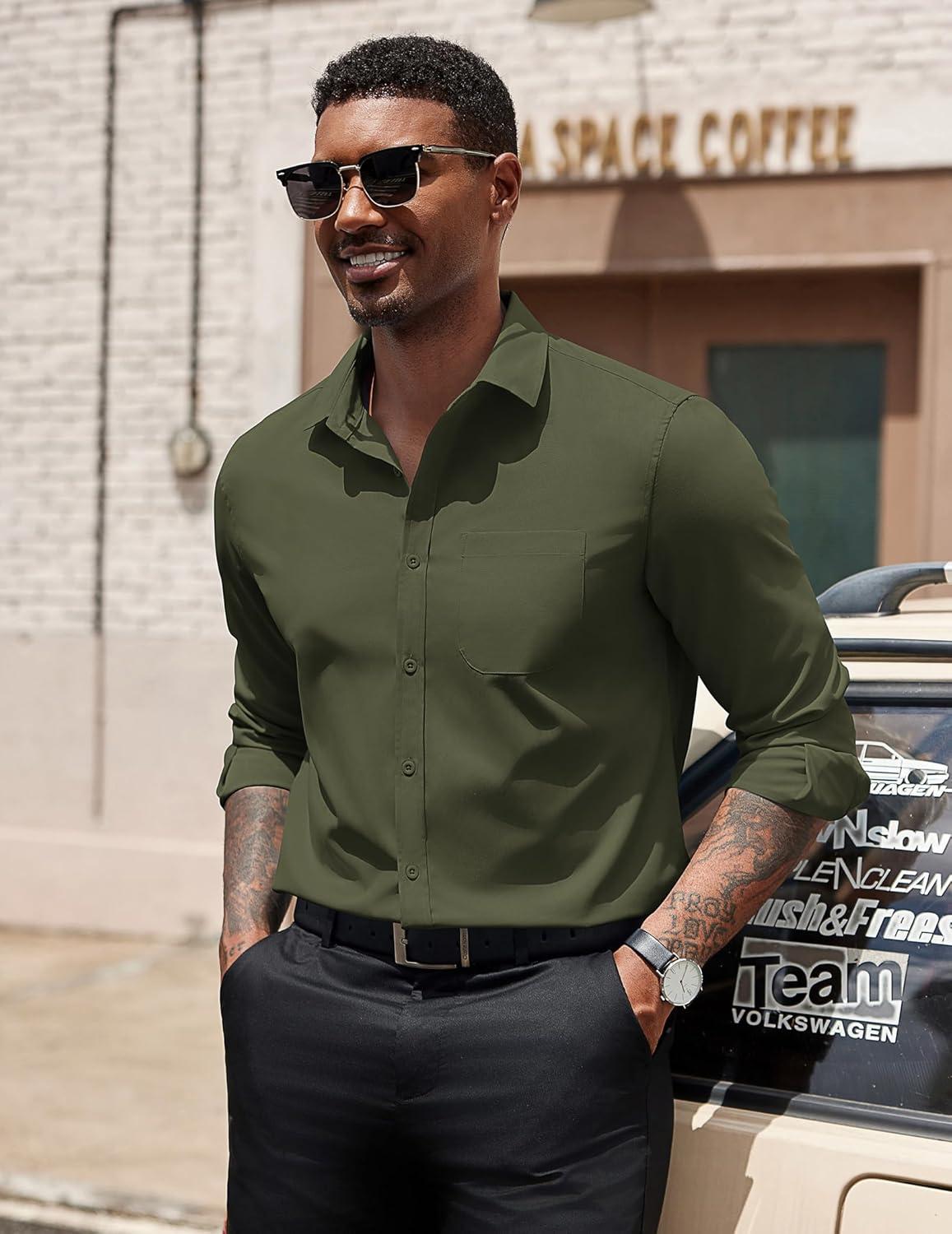 COOFANDY Men’s Dress Shirts Long Sleeve Button Down Formal Shirt Regular Fit Solid Business Casual Shirts(Army Green)