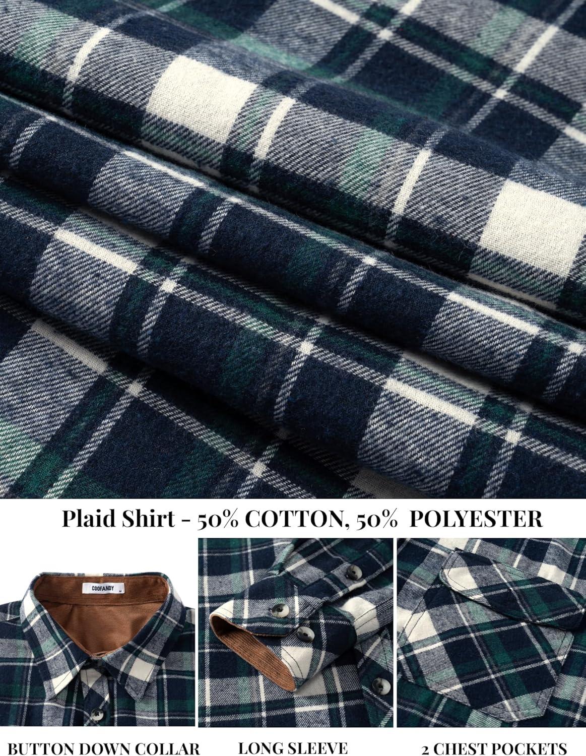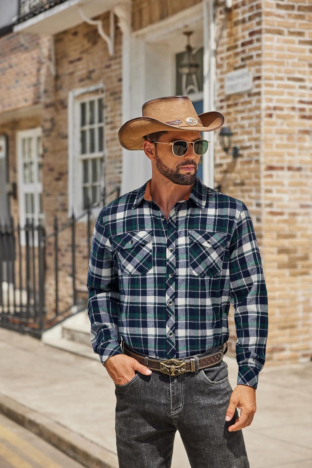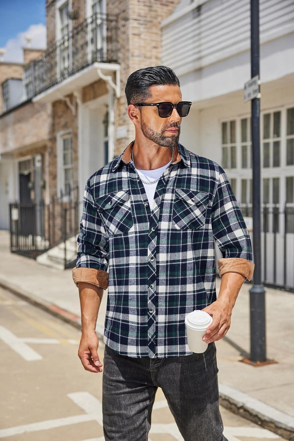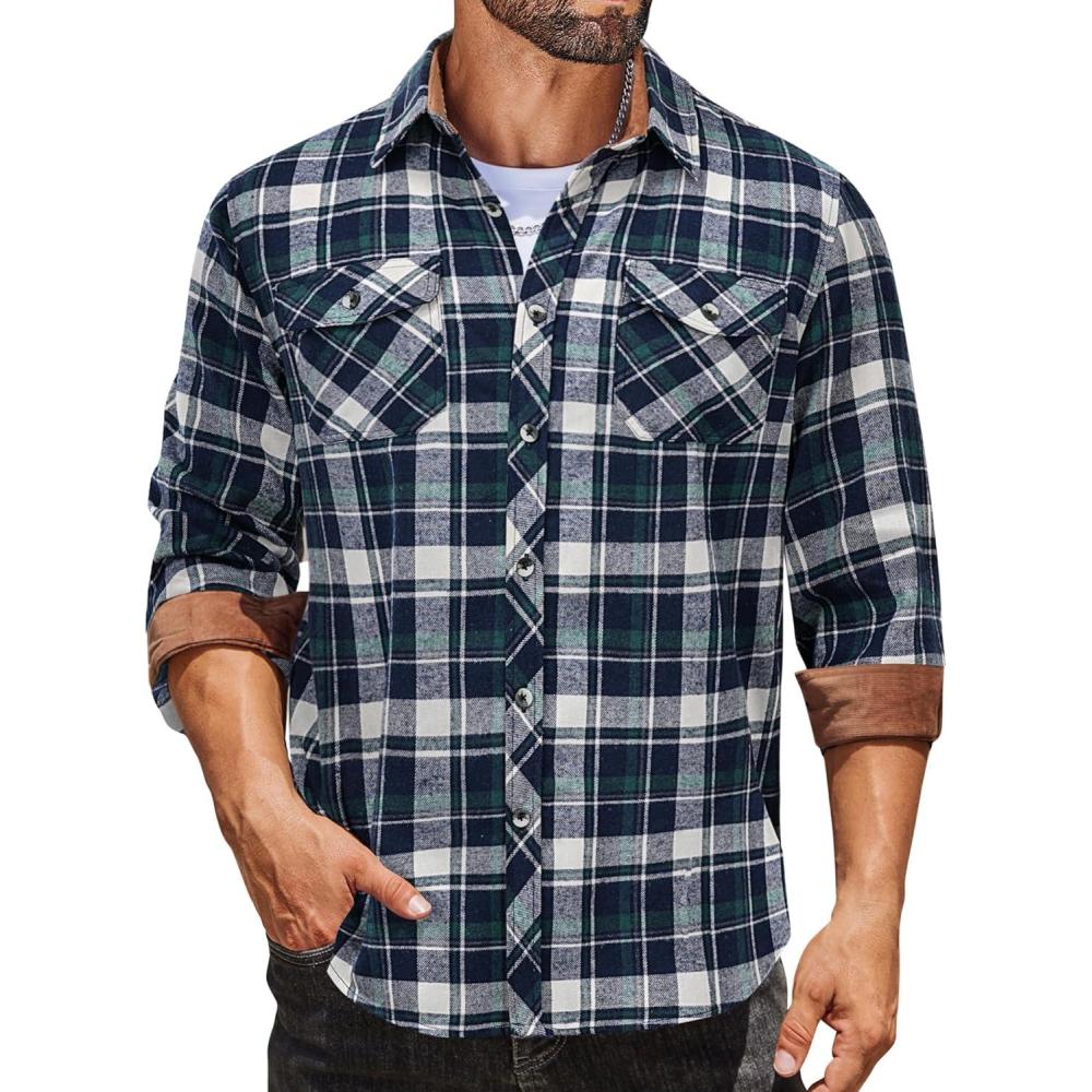 COOFANDY Men’s Fall Plaid Button Down Shirt Long Sleeve Casual Cowboy Work Shirts Lightweight Flannel Shirts Two Pocket(Plaid-grey&green&navy)