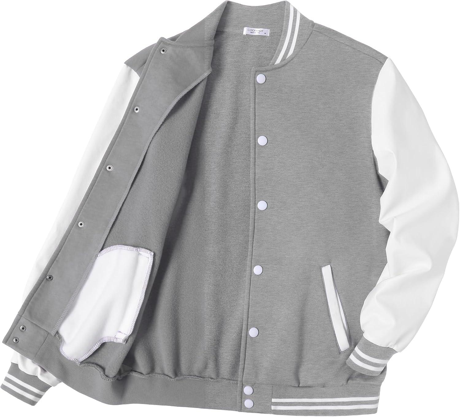 COOFANDY Mens Fashion Varsity Jackets Leather Sleeve Slim Fit College Baseball Letterman Bomber Coat(Grey)