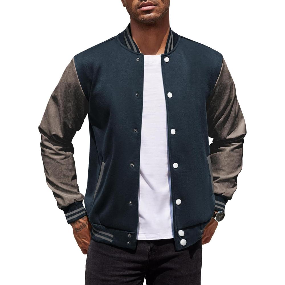 COOFANDY Mens Fashion Varsity Jackets Leather Sleeve Slim Fit College Baseball Letterman Bomber Coat(Navy-grey)