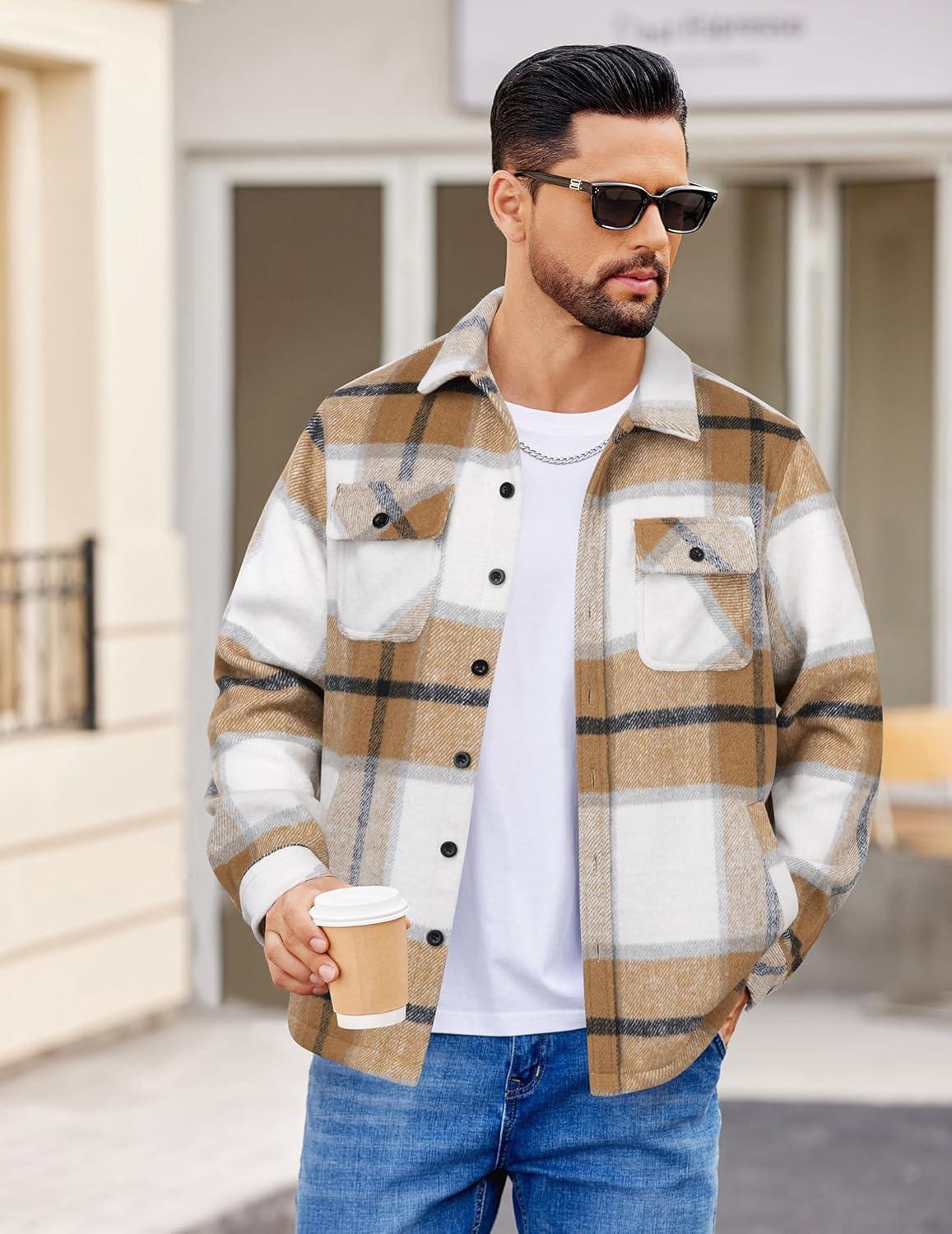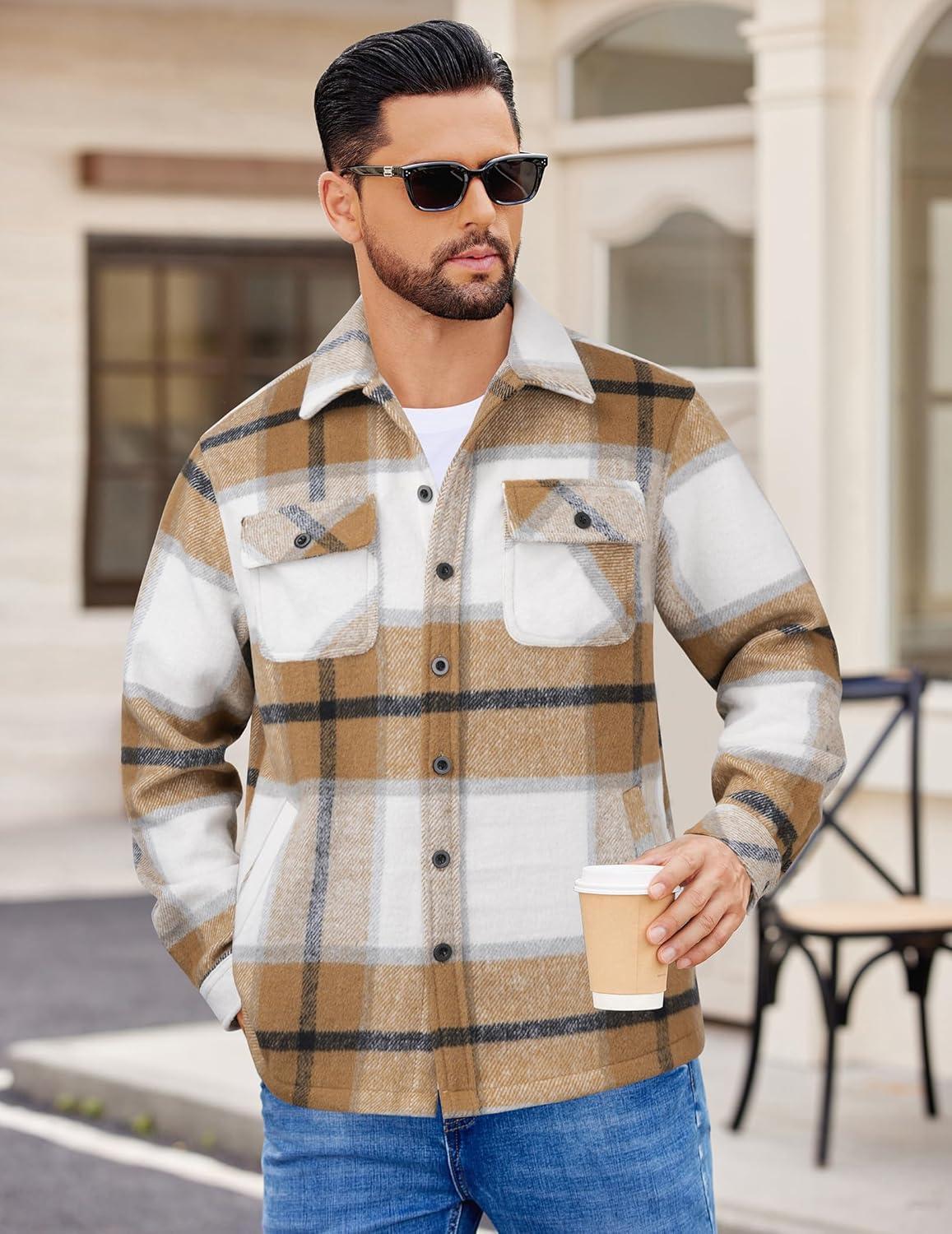 COOFANDY Men’s Flannel Jacket Plaid Shirt Jackets Fleece Shacket Long Sleeve Button Down Fall Thick Warm Outwear(Khaki Block)
