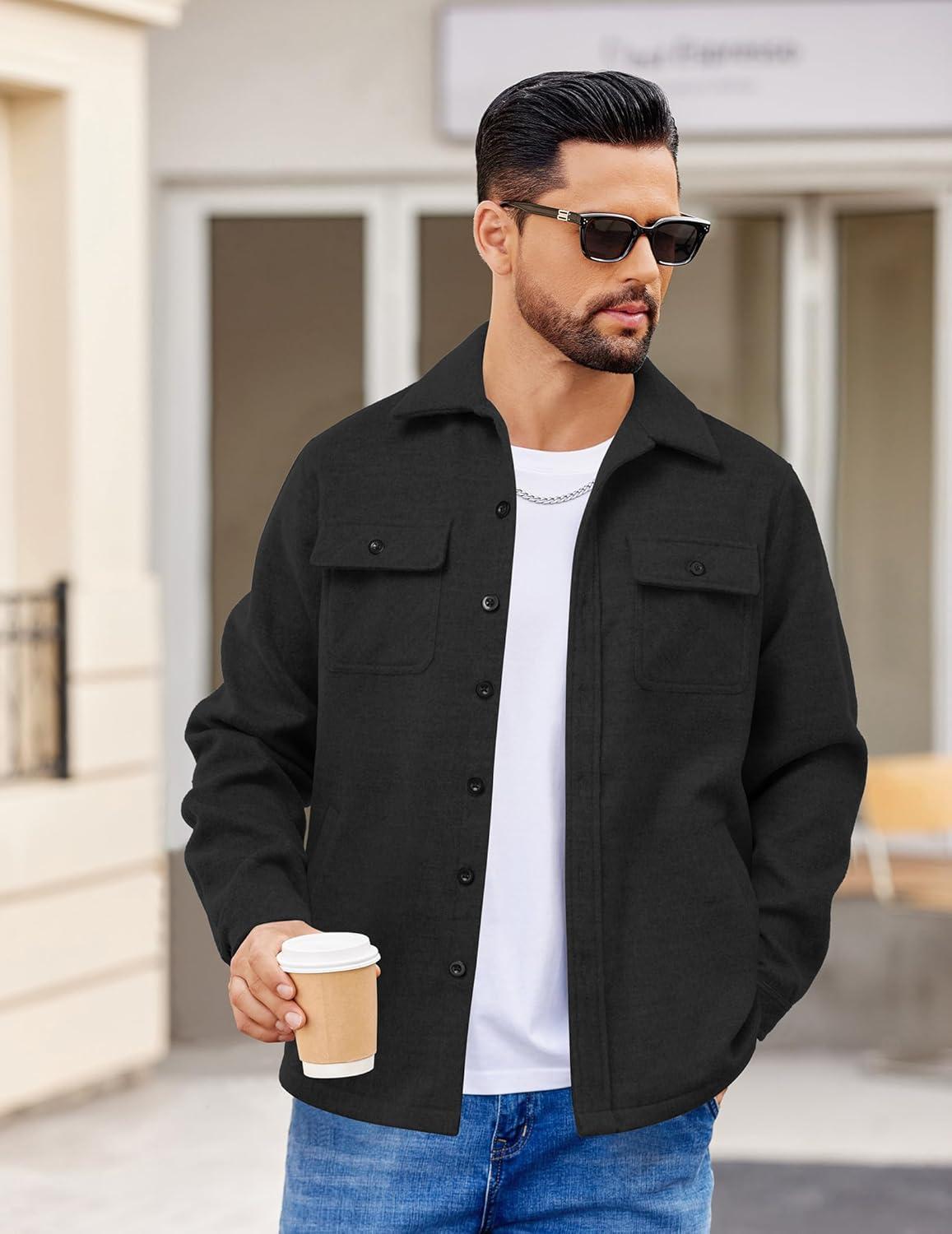 COOFANDY Men’s Flannel Jacket Plaid Shirt Jackets Fleece Shacket Long Sleeve Button Down Fall Thick Warm Outwear(Pure Black)