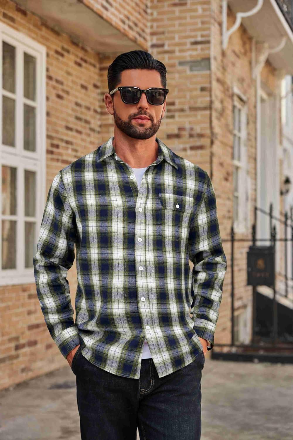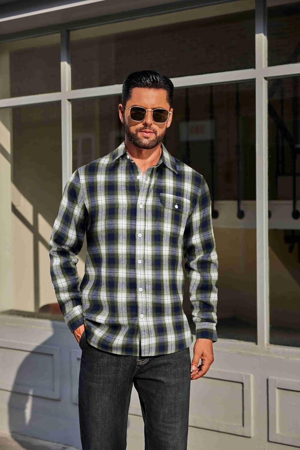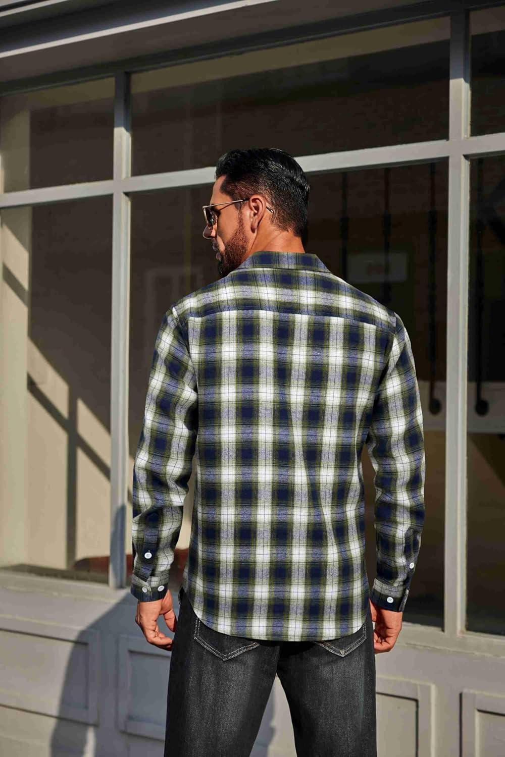 COOFANDY Mens Flannel Plaid Shirts Long Sleeve Casual Button Down Cotton Shirt with Pocket(Navy Green Plaid)