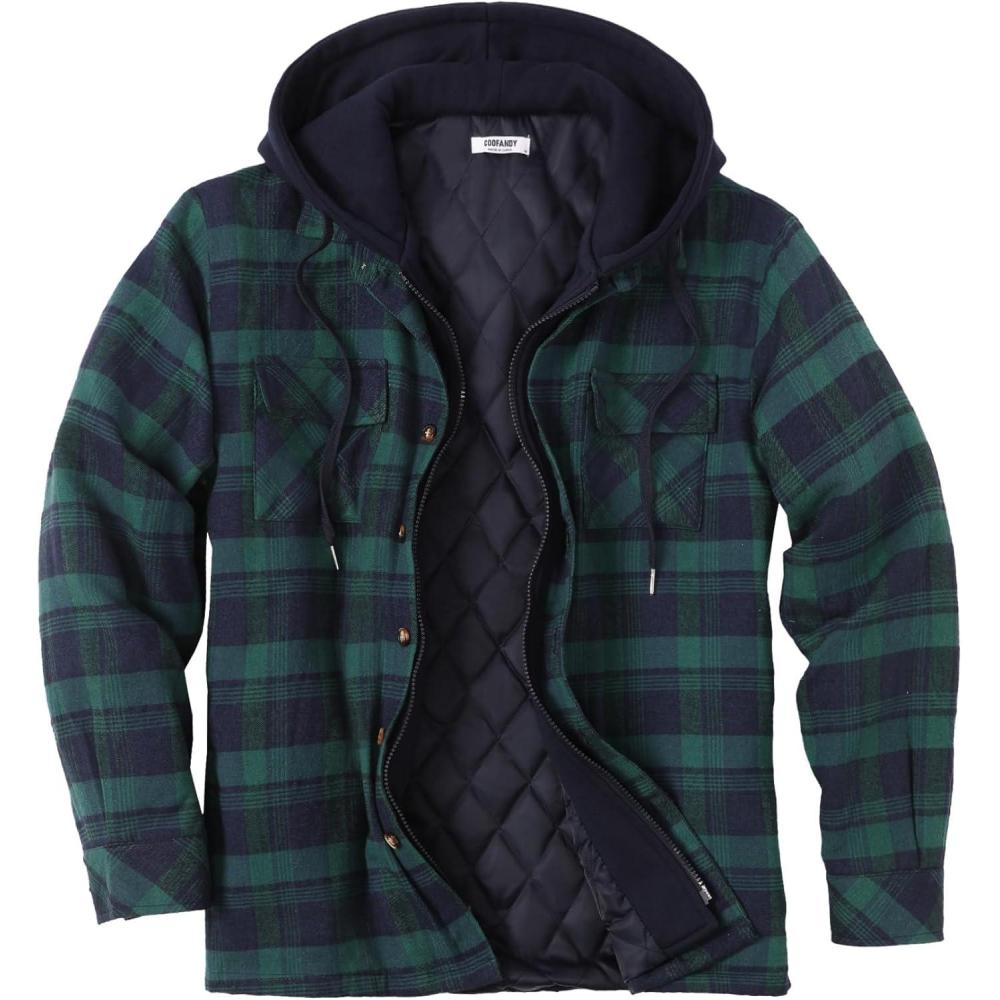 COOFANDY Men’s Flannel Shirt Jacket Warm Quilted Lined Hooded Long Sleeve Plaid Shirt Jackets(Blue & Green Plaid)