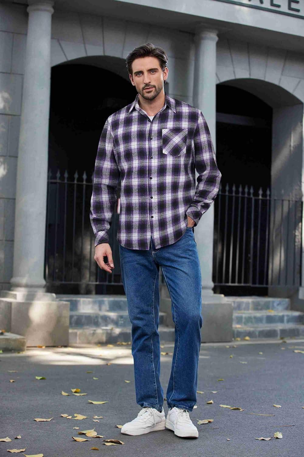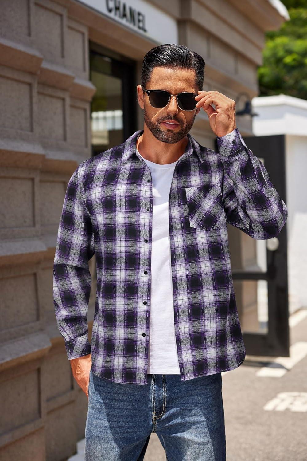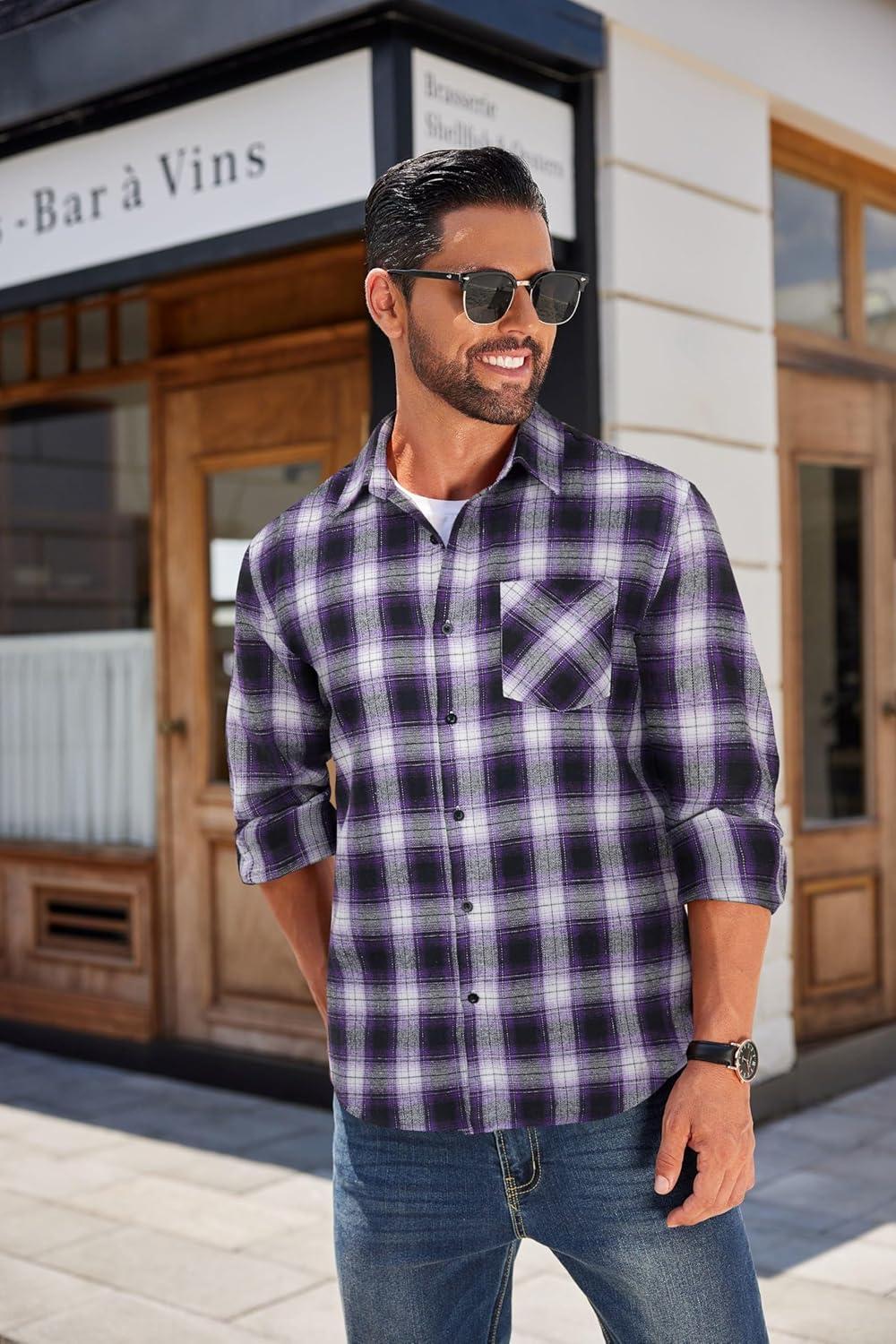 COOFANDY Men’s Flannel Shirts Long Sleeve Button Down Plaid Shirt Lightweight Shirt Jacket(Purple White Black)