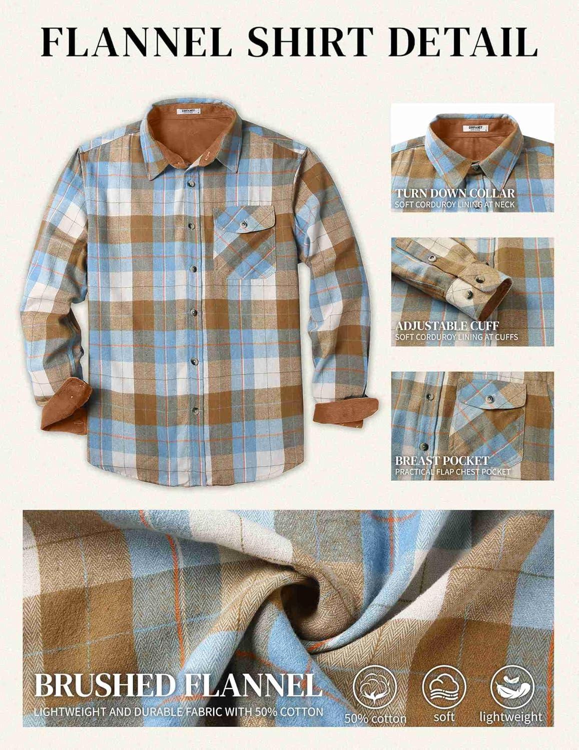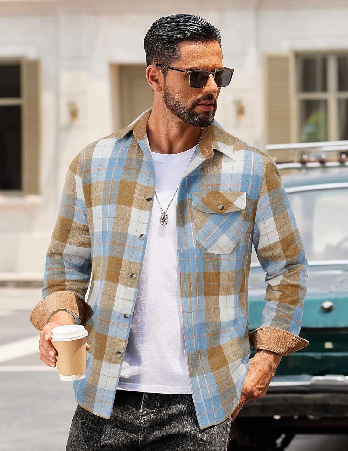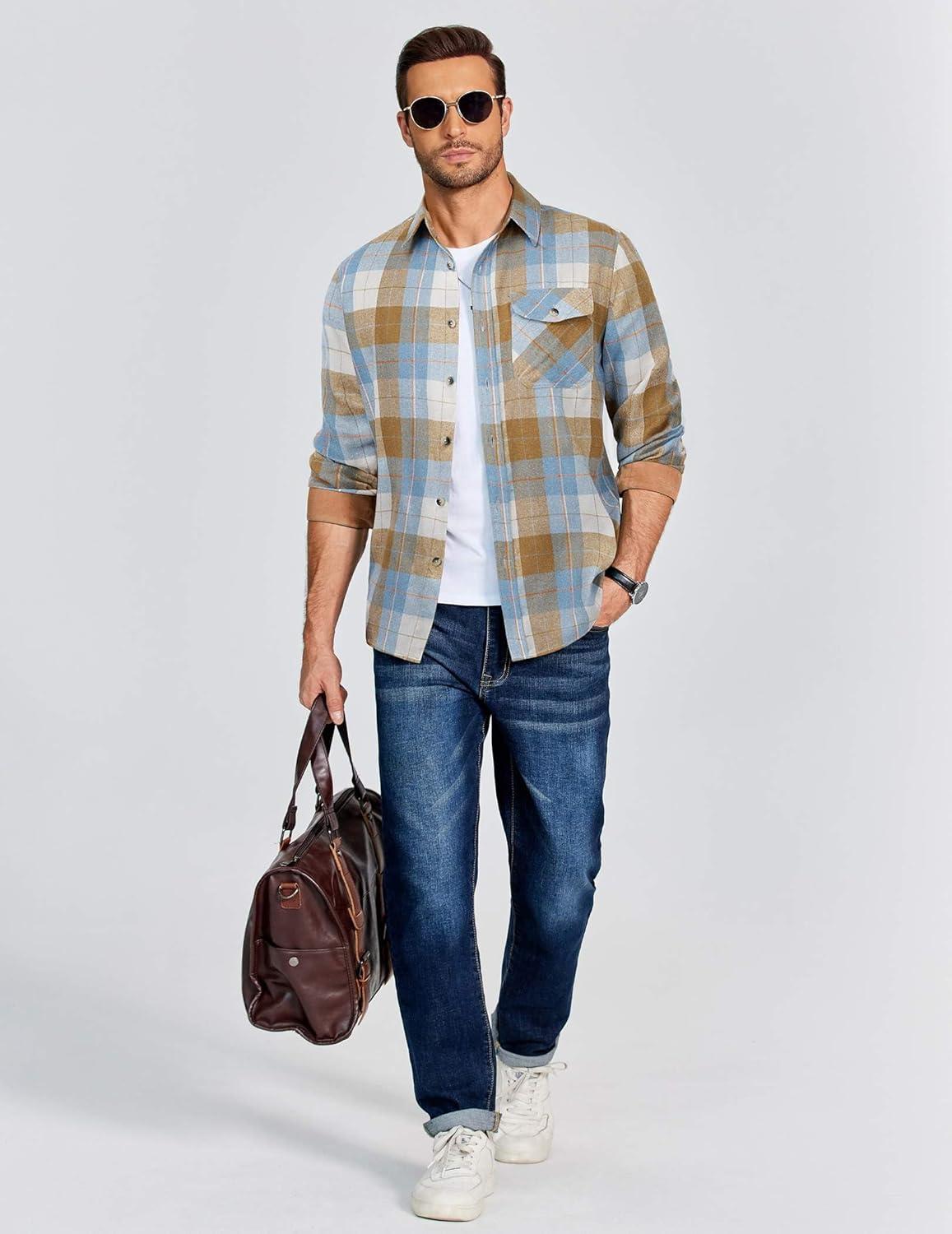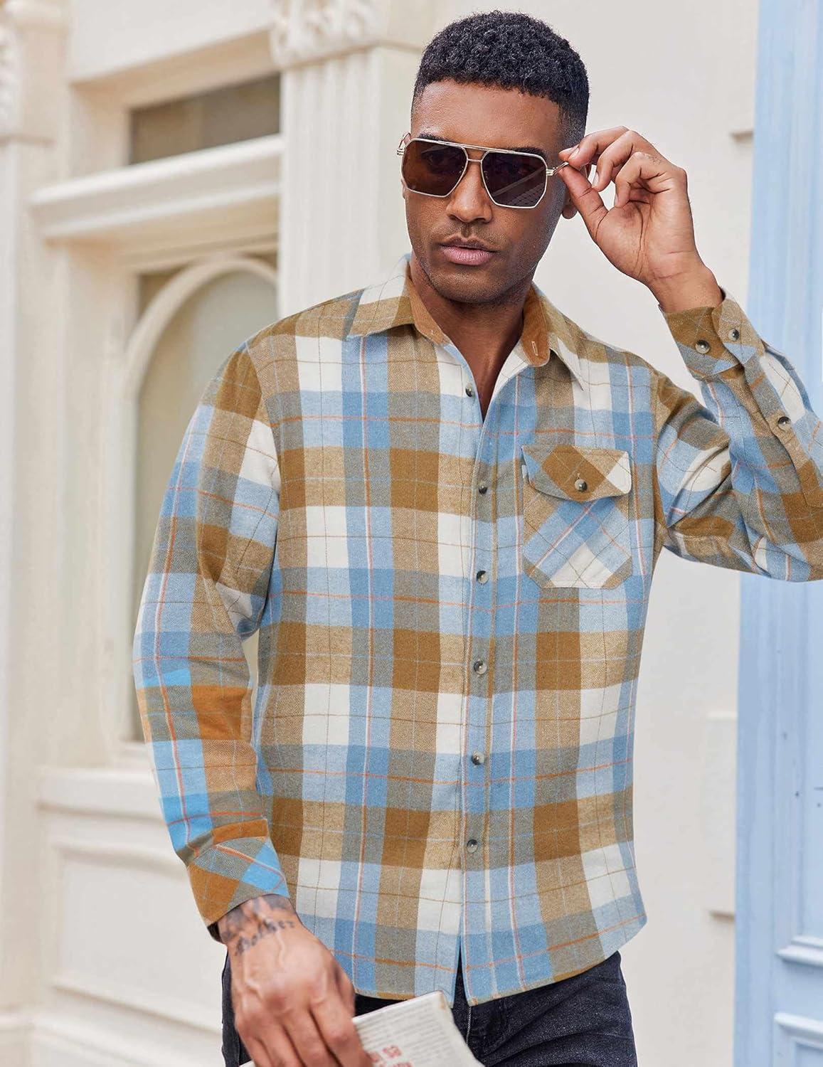 COOFANDY Mens Flannel Shirts Long Sleeve Button Down Shirt Casual Plaid Shirts with Pocket(Blue Brown Plaid)