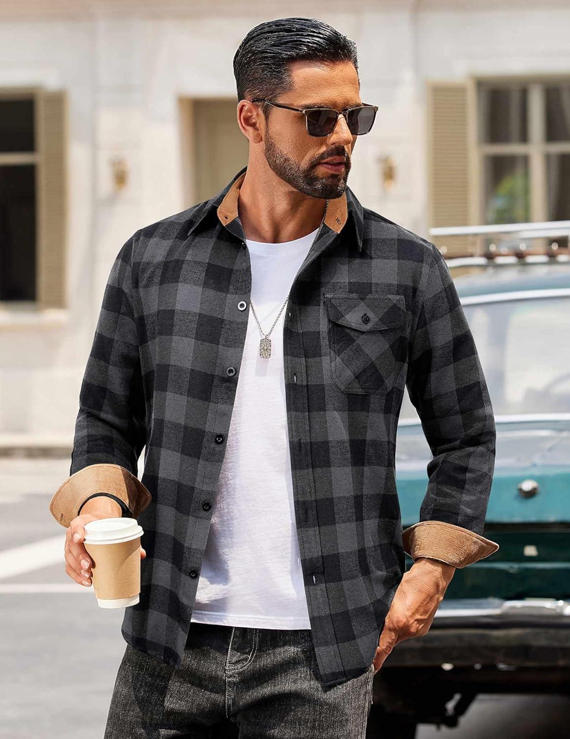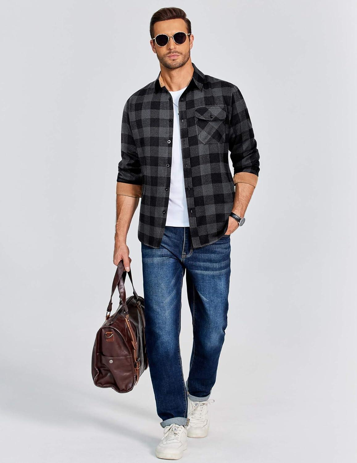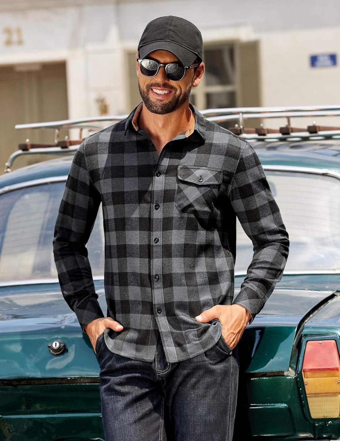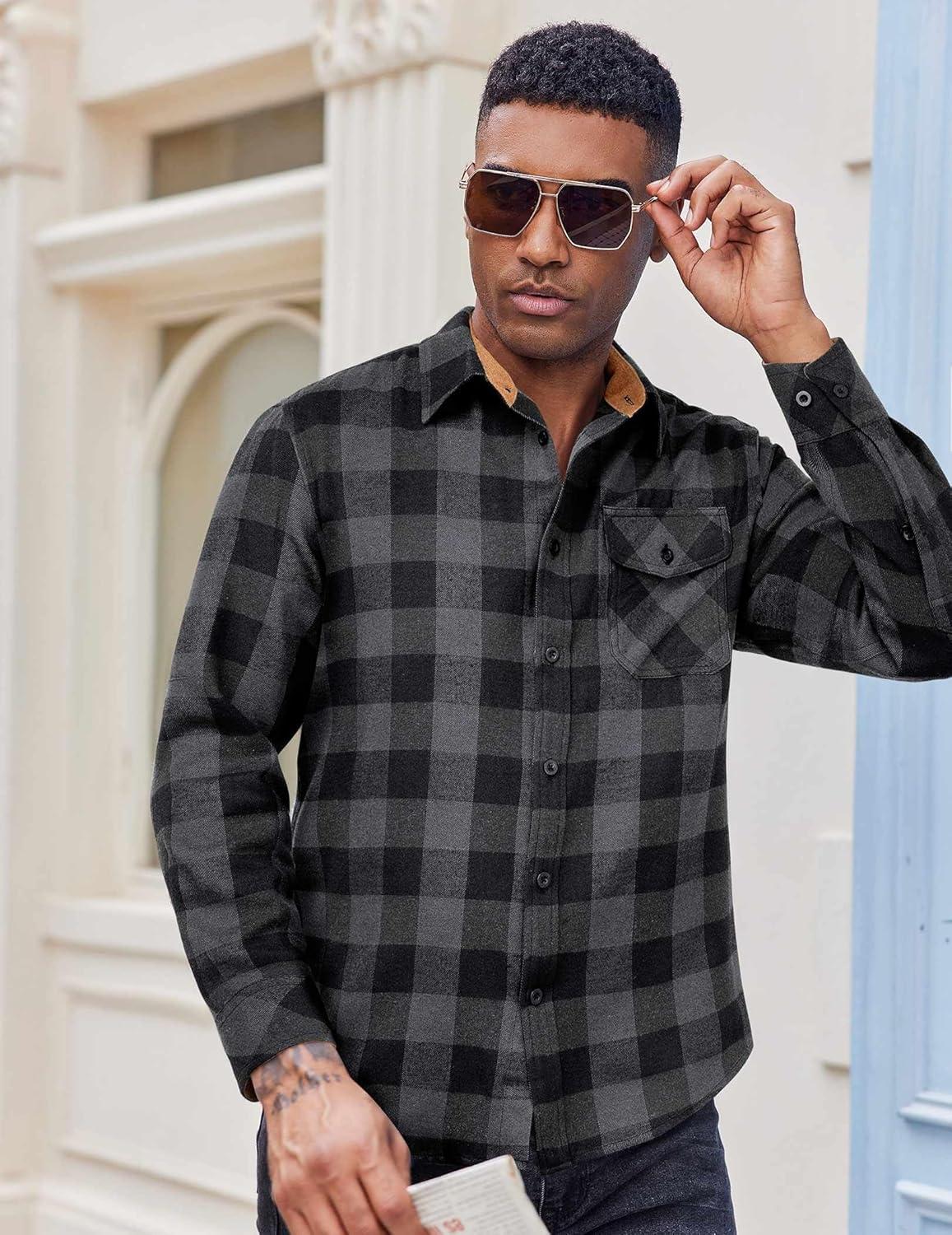 COOFANDY Mens Flannel Shirts Long Sleeve Button Down Shirt Casual Plaid Shirts with Pocket(Grey Black Plaid)